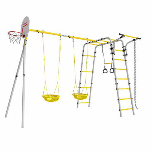 Комплектация комплекса включает в себя баскетбольное кольцо (d=0,3 м), канат, кольца с перекладиной, гимнастическую лестницу, рукоход, турник подвижный и качели сетка. Допустимая нагрузка на комплекс составляет 100 кг, а на навесное оборудование - 50 кг.