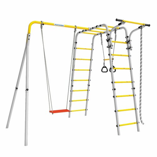 Комплектация комплекса включает в себя канат, гимнастические кольца, лестницу, рукоход, турник и качели. Это позволяет детям заниматься различными видами спорта и игр, развивая свои физические навыки и координацию.