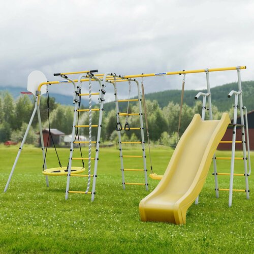 Комплектация: баскетбольный щит, рукоход, кольца с перекладиной, канат, гимнастическая лестница, турник подвижный, качели гнездо, качели пластиковые, горка