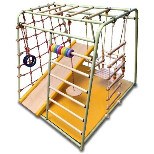 Детский комплекс для малышей самого раннего возраста. Базовая комплектация: Металлический каркас Светло-бежевые перекладины, Гимнастический мат складной 0,95 х 1,25 х 0,04 м, Детские веревочные качели с мягким сиденьем, Кольца гимнастические, Веревочная лестница 6 ступеней, Трапеция, Диск-тарзанка, Сетка - паутинка, Горка с мягкими бортиками: Материалы: ламинированное ДСП, дерево, поролон, кожзам, Счёты детские для ДСК Весёлый малыш. Размеры комплекса: Высота - 1,17 м. Длина - 1,31 м. Ширина - 1,07 м.