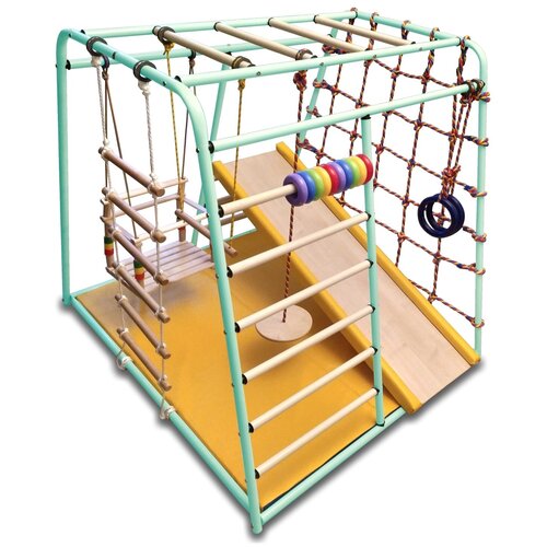 Детский комплекс для малышей самого раннего возраста. Базовая комплектация: Металлический каркас Светло-бежевые перекладины, Гимнастический мат складной 0,95 х 1,25 х 0,04 м, Детские веревочные качели с мягким сиденьем, Кольца гимнастические, Веревочная лестница 6 ступеней, Трапеция, Диск-тарзанка, Сетка - паутинка, Горка с мягкими бортиками: Материалы: ламинированное ДСП, дерево, поролон, кожзам, Счёты детские для ДСК Весёлый малыш. Размеры комплекса: Высота - 1,17 м. Длина - 1,31 м. Ширина - 1,07 м.