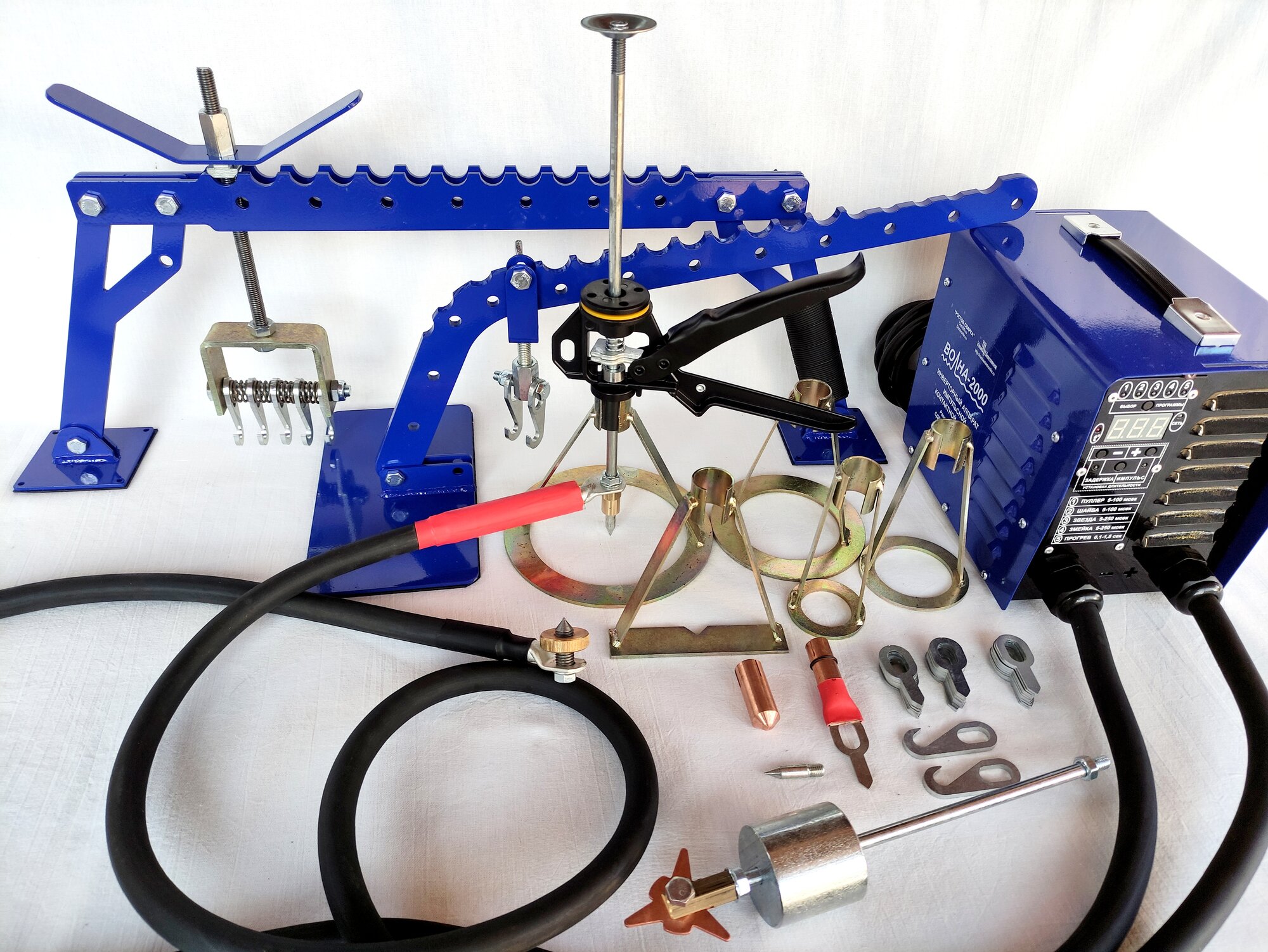 Споттер Волна 2000, пуллер с пятью опорами, быстросъёмные переходники для приварки шайб и прогрева металла, пуля и звезда с перехрдниками для пуллера и молотка, обратный молоток 0,8кг, 30шайб, масса приварная, рычаг 8х500мм, рычагомост.