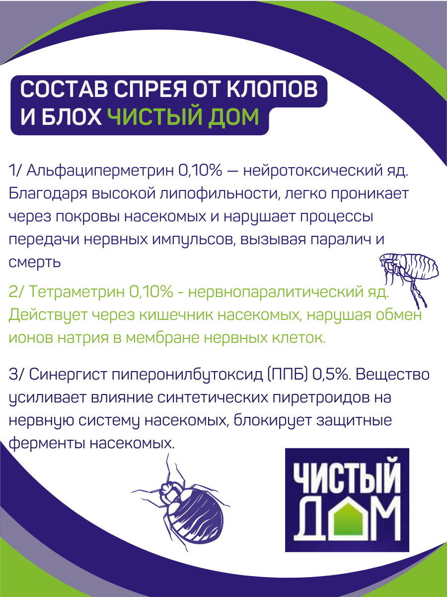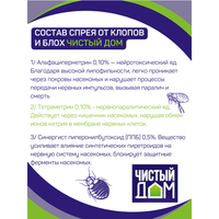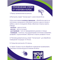 Препарат мгновенного действия. Для быстрого и эффективного уничтожения клопов, блох, мух (места посадки), кожеедов, тараканов, муравьев в жилых и нежилых помещениях. Спрей с экстрактом ромашки. Инструкция ПО применению: 1/ Перед применением встряхнуть. 2/ Распылять спрей “Чистый Дом” с расстояния 20 см. 3/ Для уничтожения клопов и тараканов – обработать места их скопления и возможного обитания (плинтусы, щели в стенах и мебели, места отхождения обоев, обратную сторону картин, ковров): - для блох – щели в полах; - для мух – места посадки; - для муравьев – пути их передвижения дорожки и гнезда; - кожеедов – плинтусы, под радиаторами отопления, кроватями, шкафами, подоконниками, обратную сторону шкафов и полок. 4/ Рекомендуемый расход спрея “Чистый Дом”: для обработки помещений площадью 14-18 кв. м. 5/ Средство распылять 3-5 секунд. 6/ Через 15 минут после обработки помещение проветривать сквозным потоком воздуха в течение 30 минут. Меры предосторожности: 1/ Не распылять вблизи открытого огня и раскаленных предметов! Предохранять от действия прямых солнечных лучей и нагревания свыше 40°С. 2/ Не разбирать и не давать детям! 3/ Распылять в отсутствии людей, домашних животных, птиц и рыб при открытых окнах (форточках). 4/ Избегать попадания средства на кожу – снять его влажным ватным тампоном (не втирая), после чего тщательно промыть кожу обильным количеством воды. 5/ При необходимости обратиться к врачу. 6/ Использованный баллон утилизировать как бытовой отход! 7/ Хранить средство в крытых, сухих, вентилируемых помещениях, вдали от огня и нагревательных приборов, отдельно от лекарственных препаратов и пищевых продуктов. Температура хранения от -20°С до + 40°С. Комплект – 5 шт.