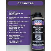 Средство Liqui Moly "Electronic-Spray" применяется для предотвращения образования коррозии в разъемах электрооборудования автомобиля. Смазывает контакты, убирает окислы и надежно защищает от коррозии. Повышает надежность работы электрооборудования автомобиля. Средство безопасно для пластиков, резины и лаковых покрытий.