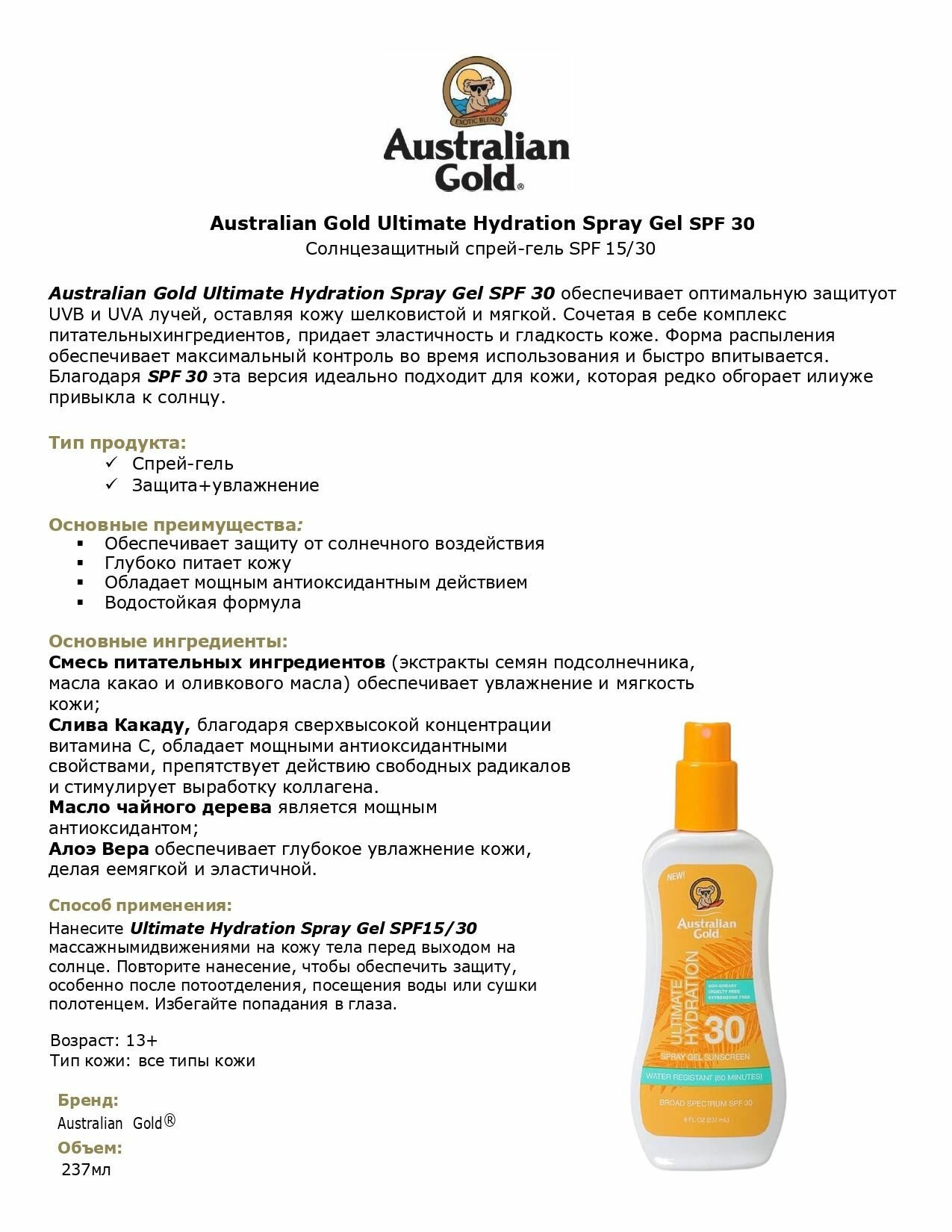 Спрей-гель Australian Gold SPF 30 Ultimate Hydration, водостойкий, для всех типов кожи, 237мл: сравнение цен, характеристики, фото, актуальное наличие и цены.