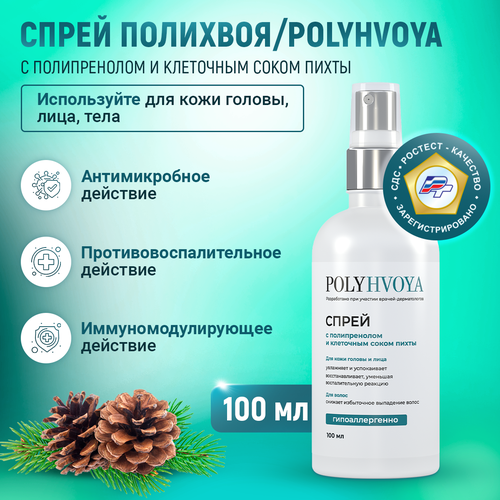 Спрей Полихвоя относится к новому типу препаратов на основе российской инновационной технологии. Продукт по-настоящему натуральный, ингредиенты получены из выросшей в диком лесу сибирской пихты. Вместе с тем, это не простой экстракт или дистиллят, это бережная и трудоемкая технология, позволяющая получить ценные ингредиенты без примесей и повреждения. Спрей разработан таким образом, чтобы можно было решать сразу несколько задач по уходу за кожей волосистой части головы, лица и тела. Склонность к себорее(жирности), шелушению, появлению воспалительных элементов зачастую проявляется на всех кожных покровах, включая лицо, тело и кожу головы. Применение спрея Полихвоя будет оптимально в случаях, когда необходимо сочетать антимикробное, иммуномодулирующее и противовоспалительное действие. А также тогда, когда требуется легкое увлажнение и тонизирование кожи. Препарат экономичен в расходе. Применение дает достаточно быстрый эффект. Спрей рекомендуется к использованию для кожи головы: -Против перхоти и себорейного дерматита -Против гнойничков и фолликулитов -Против выпадения волос и для улучшения роста -Для борьбы с зудом и раздражением, особенно инфекционного и воспалительного характера. Рекомендации по использованию для кожи лица. Спрей подойдет как для ухода за жирной кожей, склонной к образованию воспалительных элементов и прыщей, а также нежелательной пигментации после них. Так и хорошо увлажнит сухую кожу. Полихвоя не содержит липидных (жировых) компонентов, поэтому отлично подходит для чувствительной кожи, которая нуждается в лифтинге и легком увлажнении, но на любые кремы реагирует «черными точками» и появлением прыщей. Рекомендации по использованию для кожи тела. Препарат рекомендуется при проявлении себорейного дерматита на теле. Устраняет мелкие папилломы и кератомы, и обеспечивает профилактику образоввания новых. При регулярном уходе уменьшает их образование и частично устраняет. Спрей оказывает профилактическое увлажняющее действие.