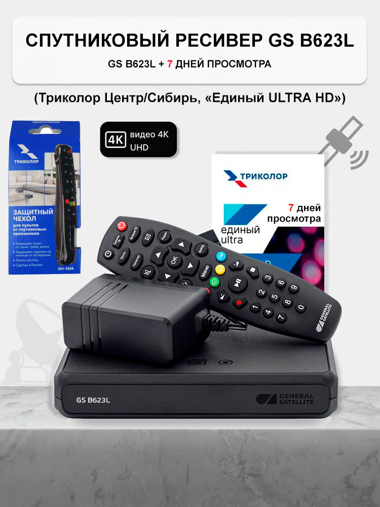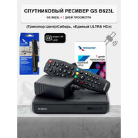 Ресивер Триколор Ultra HD GS B523L/B623L/B626L с подпиской на 7 дней просмотра пакета "Единый ULTRA" (более 200 каналов + 9 каналов в качестве Ultra HD 4К). Абон. плата 2500 рублей в год. Новый двухтюнерный приемник с поддержкой ULTRA HD GS B523L/B623L/B626L осуществляет прием каналов стандартного, высокого и сверхвысокого разрешения. Отличительной особенностью приёмника GS B523L/B623L/B626L являются мощный микропроцессор от ALi нового поколения, наличие дисплея, Timeshift (отложенный просмотр), PVR (запись эфира), Кинозалы, Лучшее на ТВ, Онлайн ТВ, Триколор ТВ-почта, Телеархив. Приёмник оборудован двумя спутниковыми тюнерами, что позволяет просматривать телеканалы не только на одном телевизоре, но и на планшете, смартфоне, а также на втором телевизоре при подключении приёмника-клиента. Внимание! Приобретая данный товар покупатель соглашается с правилами обязательной регистрации как абонента в системе Триколора через дилерский кабинет продавца, с предоставлением данных для регистрации (фамилия, имя, отчество, дата рождения, паспортные данные, адрес установки, номер мобильного телефона). Данные предоставляются продавцу исключительно для регистрации в системе Триколора. Конфиденциальность данных гарантируется. Товар является технически сложным. КомплектацияДвухтюнерный приёмник-сервер GS B523L/B623L/B626L;Пульт дистанционного управления; Адаптер электропитания;Элементы питания для пульта (2 шт.);Подписка Триколор на 7 дней просмотра пакета "Единый ULTRA"; Чехол для пульта.