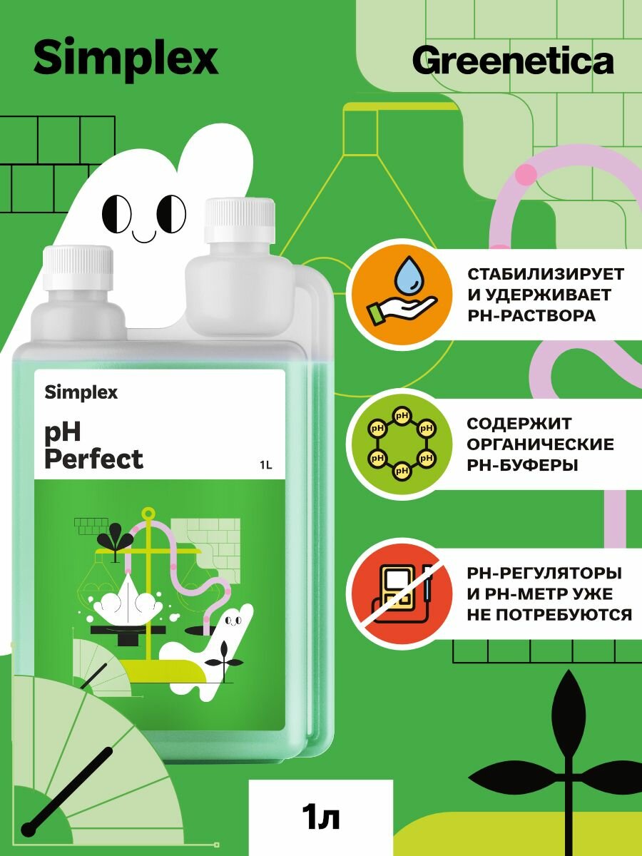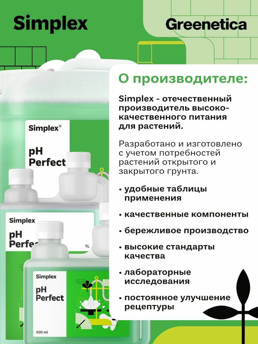Simplex рН Perfect — регулятор рН питательного раствора. Содержит рН-буферы, которые стабилизируют и удерживают рН раствора в диапазоне 5,7 – 6,3. Simplex рН Perfect практически не влияет на ЕС питательного раствора, что делает его внесение практически незаметным для растения.