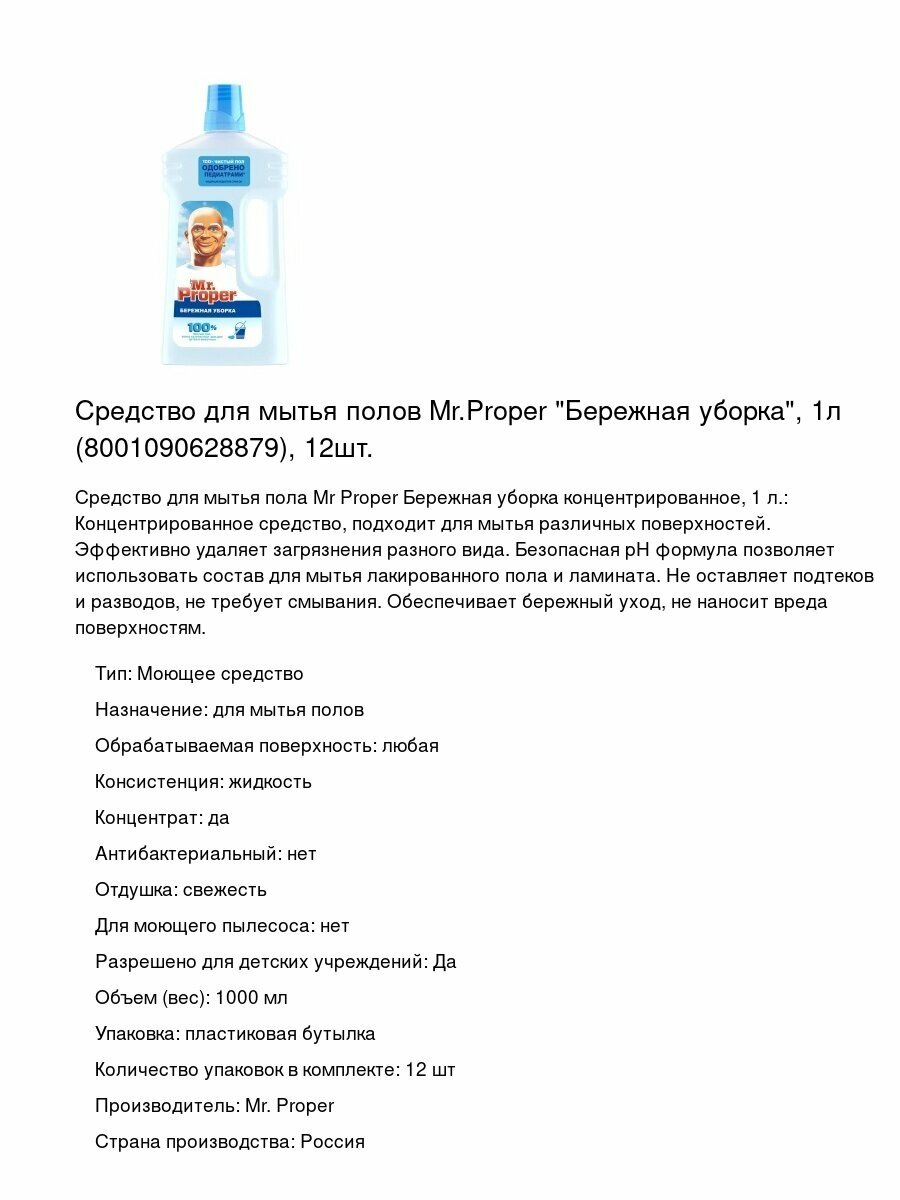 Выбирая средство для мытья полов Mr. Proper "Бережная уборка", вы получаете качественный и эффективный продукт для уборки вашего дома.