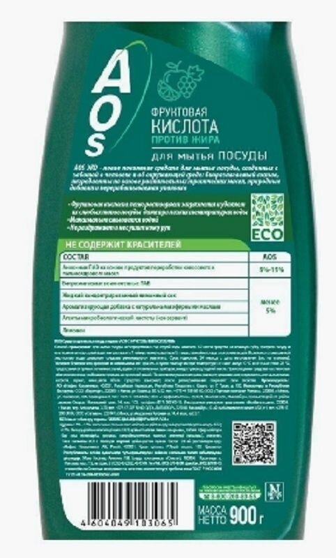 Средство для мытья посуды AOS из серии ECO с фруктовыми кислотами предлагает эффективное и экологичное решение для чистки посуды. Объем средства составляет 0.9 литра, а вес — 0.9 кг. Это средство разработано с учетом всех аспектов, влияющих на окружающую среду, и обладает эко-сертификатом № 0507809 РОСС. РЭК.016. А01334 системы добровольной сертификации Росэкопродукт.