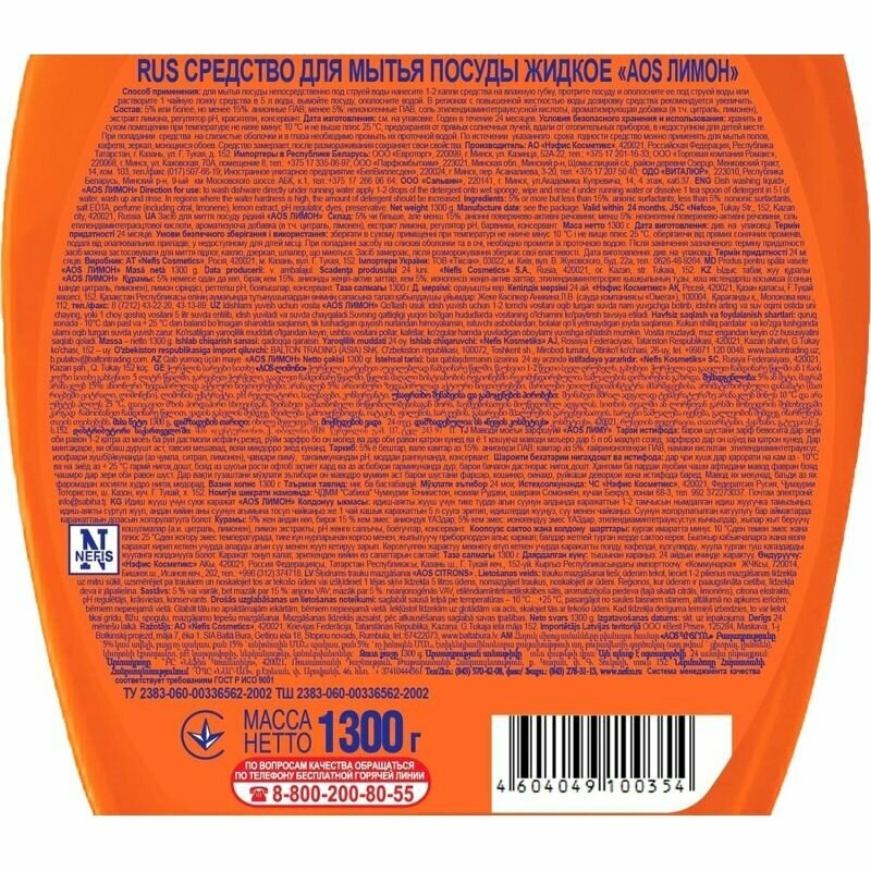 Бренд AOS в декабре 2022 года четвертый раз признан «Маркой № 1 в России» в категории «Средство для мытья посуды». Экстракт лимона в сочетании с активным комплексом ПАВ эффективно удаляют загрязнения даже в холодной воде, само средство полностью смывается с поверхности посуды. Гелеобразная консистенция жидкости для мытья посуды образует плотную, долгоиграющую пену, которая превосходно расщепляет даже самые сложные жировые загрязнения. Прекрасное действие моющего средства для посуды в холодной воде, приводящее к использованию меньшего количества горячей воды. Общий вес средства для мытья посуды 5,2 кг или 5 литров. Формула AOS Лимон - рекордсмен экономичности: средство занесено в Книгу рекордов России по количеству отмытых тарелок. Бренд AOS занимает одну из лидирующих позиции в основных категориях рынка бытовой химии. При создании этого моющего средства ученым-технологам удалось добиться важного качественного преимущества. Отличительная особенность АОS в том, что он отлично отмывает жир и грязь и сам полностью смывается водой, обеспечивая экологическую безопасность вымытой посуды. В 2005 году AOS занесен в Книгу рекордов России как самое экономичное средство для мытья посуды. Одной бутылочкой АОS для посуды было отмыто 9664 тарелок, это абсолютный рекорд. Средство для посуды AOS становилось многократным победителем отраслевых конкурсов, тестирующих качество продуктов бытовой химии «Бытхимэкспо», «100 лучших товаров» России и несколько раз признавалось победителем в национальном конкурсе предпочтений потребителей и получал премию «Марка №1 в России».