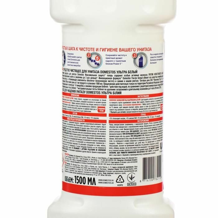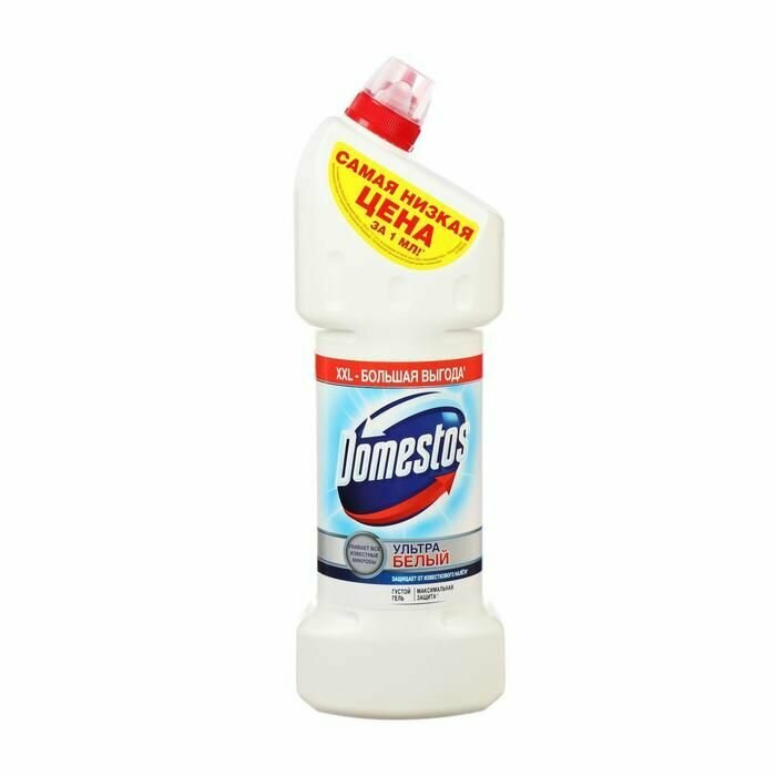 Наше здоровье напрямую зависит от гигиены как в доме, так и за его пределами, особенно это касается туалета. Domestos активно сотрудничает с юнисеф и проводит кампанию Чистый туалет – каждой школе, чтобы школьники России могли получить доступ к чистым современным туалетам. Дезинфицирующие средства Domestos, в составе которых есть мощный антисептик гипохлорит натрия, и другая бытовая химия Domestos максимально очищают поверхности. Средства убивают до 100 % известных вирусов, бактерий, плесени, спор и других видов микробов (по результатам тестов Unilever). Средство чистящее для унитаза Domestos ультра белый, 1500 мл — эффективный cleaners-продукт, который поможет поддержать гигиену в доме. Он имеет густую гелевую текстуру, что обеспечивает экономичный расход и 100% защиту от налета. Чистящее средство для туалета универсально и подойдет как для обработки туалета и ванной комнаты, так и для чистки кафеля, дезинфекции раковины и рабочих поверхностей на кухне и во всем доме. В разбавленном виде гель-дезинфектант Domestos можно использовать при мытье полов и для санитарной обработки помещения с целью борьбы с распространением вирусов или бактериальных инфекций. Универсальное средство Domestos Белый для унитаза максимально очищает любые поверхности и полностью уничтожает неприятные запахи. Благодаря дозатору гель удобно наносится под ободок унитаза и на другие труднодоступные места. За счет активной хлор-формулы Domestos уничтожает опасные вирусы и другие известные микробы, поэтому средство Domestos подходит для эффективной дезинфекции. Благодаря густой инновационной формуле Domestos гель предотвращает появление известкового налета и сохраняет свою эффективность до пяти смываний (инструментальные тесты Unilever). Чистящий гель убивает бактерии, грибки, вирусы и споры, которые могут вызывать болезни у взрослых и детей. Для поддержания чистоты в доме используйте средство регулярно при каждой уборке. Каждый Domestos обеспечивает чистоту и безопасность туалетов в школах. Каждый U творит добро.
