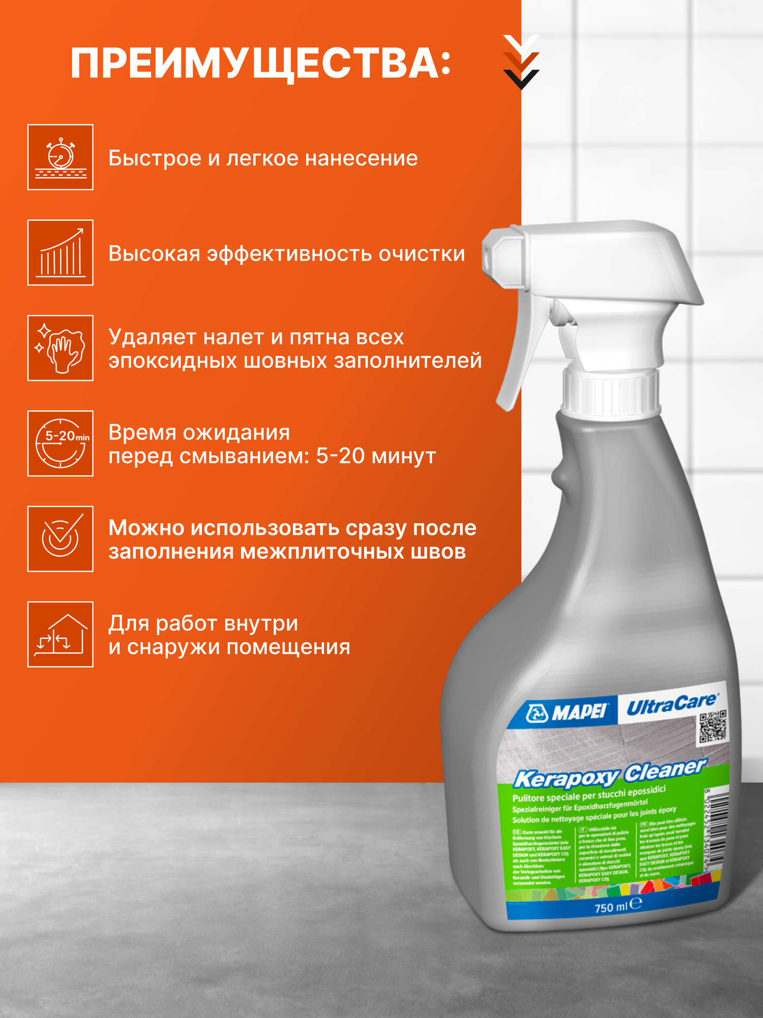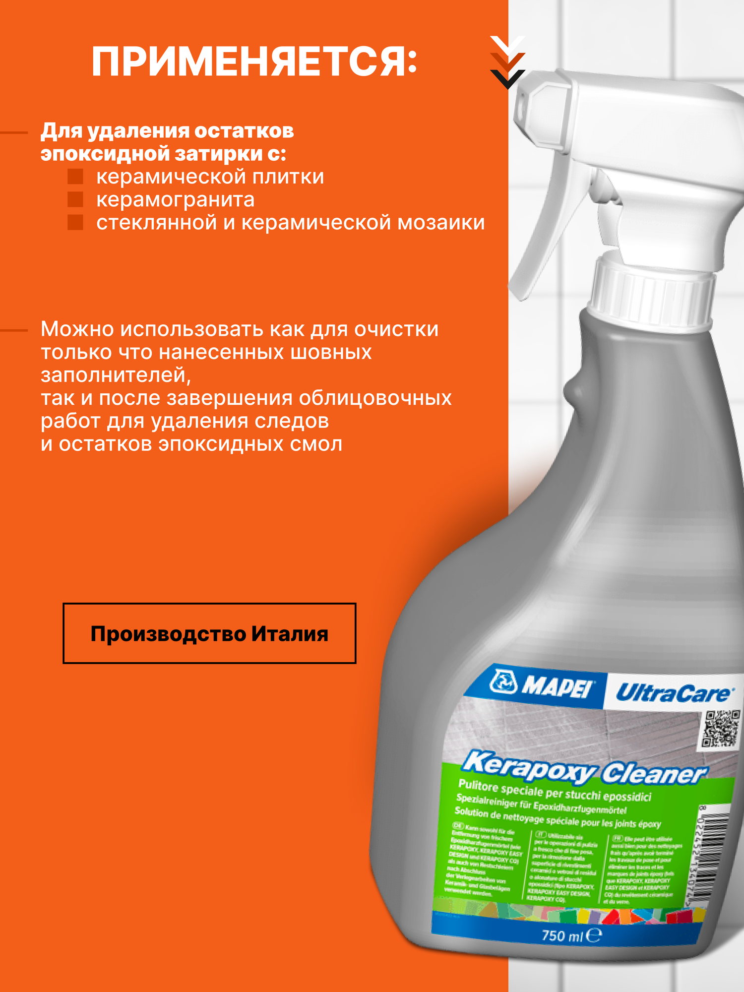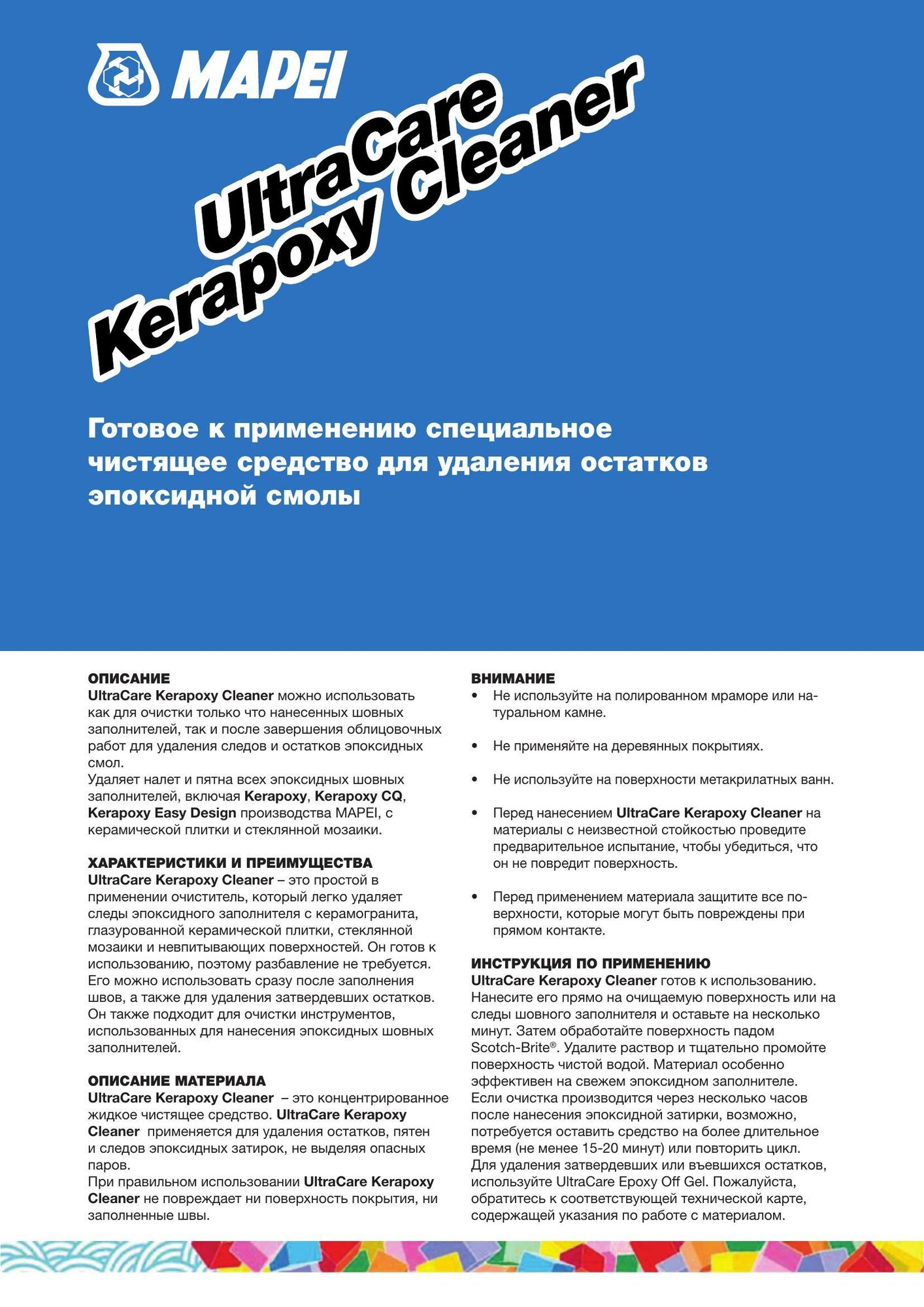 Новая версия старого продукта! ULTRACARE KERAPOXY CLEANER Новый улучшенный очищающий раствор для удаления остатков эпоксидной затирки с керамических и керамогранитных плиток, стеклянных и фарфоровых мозаик, плиток из натурального и искусственного камня. Основным назначением продукта является удаление остатков раствора после окончательной очистки водой. Очиститель можно также использовать для удаления небольших поверхностных пятен, которые могут остаться после высыхания шовного заполнителя на следующий день. При правильном применении не повреждает ни поверхность плитки/мозаики ни заполненных швов.