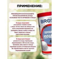 Порошок Брос 200 г уничтожает садовых тёмно-бурых, чёрных муравьёв, которые обитают в саду и в частных домах. Средство от муравьев - профессиональное мощное средство против ползающих вредителей. Работает гораздо лучше, чем борная кислота: обеспечивает надежный защитный эффект от ползающих насекомых, достаточно обработать им места перемещения муравьев или муравейник. Специально подобранные составляющие делают препарат исключительно привлекательным для насекомых и обеспечивают его высокую эффективность уже после первого применения. Универсальная хозяйственная отрава может применяться для различной обработки: как для посыпания, так и для полива. Эффективное средство от муравьев домашних BROS выглядит как порошок , для уничтожения насекомых в жилых, складских, дачных и других помещений (внутри и снаружи), а так же в саду теплице, на улице, на даче, на террасе, на деревьях, на грядках. Универсальный препарат от домашних муравьев безопасен для детей и взрослых людей. Порошок для борьбы с муравьями не вызывает адаптацию у насекомых. Уничтожитель содержит кормовую приманку и яд (хлорпирифос 2%) который уничтожает гнездо, всю колонию (муравейник) и королеву. Ловушка для защиты от муравьев, не отпугиватель, а отрава, которая устанавливается в местах скопления насекомых или путях их следования. Инсектицид BROS высокоэффективное средство для дезинсекции, смешав с жидкостью получится раствор для обрызгивания (спрей) и обработки садовой территории и растений. Средство от муравьев садовых гранулы. От насекомых для дома один раз приобретите порошок и вам не придётся тратить время и нервы для эффективной отравы и ловушки против муравьев в доме на даче в квартире.