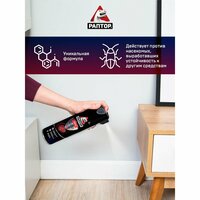 Внимание! Товар продается комплектом:[Средство от насекомых раптор Аэрозоль от резистентных тараканов 430мл] X 4 шт. Средство от насекомых раптор Аэрозоль от резистентных тараканов 430мл - это средство от самых живучих тараканов, на которых перестали действовать привычные средства. Предназначен для применения внутри помещений. Аэрозоль при распылении образует капли, которые, попадая на насекомых, приводят к быстрому проникновению инсектицида в тело через хитиновый покров и дыхательную систему, убивая насекомых за короткое время. Часть капель оседает на пол и другие поверхности, на которые садятся или по которым ползают насекомые, тем самым обеспечивается длительная защита помещения. - Универсальный аэрозоль за считанные минуты избавит вас от насекомых в помещении. - Высокоэффективная многокомпонентная формула гарантирует защиту от широкого спектра насекомых. - Профессиональная защита от ползающих насекомых. - Мгновенное действие и продолжительный эффект. Способ применения: - Баллон перед использованием встряхнуть. - Обработку проводить при открытых окнах. - Распылять точечно с расстояния 20 см от поверхности на насекомых и места их обитания. - Общее время распыления: не более 15 сек в помещении площадью 10 м. - Обработать места обитания и передвижения насекомых струей аэрозоля с расстояния 20 см от поверхности. - Норма расхода - 20 г (5 секунд распыления) на квадратный метр поверхности. - Затем проветрить помещение 30 минут сквозным потоком воздуха и провести влажную уборку поверхностей, с которыми могут соприкасаться люди. Против тараканов: обработать места их обитания, щели, за трубами, задние стороны мебели. Против клопов: только места обитания (постельные принадлежности не обрабатывать!) Против блох: щели за плинтусами, подстилки животных, которые затем выстирать перед использованием. Против муравьев: места их передвижения (дорожки), против сверчков, уховерток, чешуйниц, пауков, мокриц - места скопления. Состав: Циперметрин (0,20%), имипротрин (0,05%), пиперонилбутоксид; растворитель; углеводородный пропеллент (пропан, бутан, изобутан). Не содержит хладонов и других озоноразрушающих веществ! Срок годности: 3 года