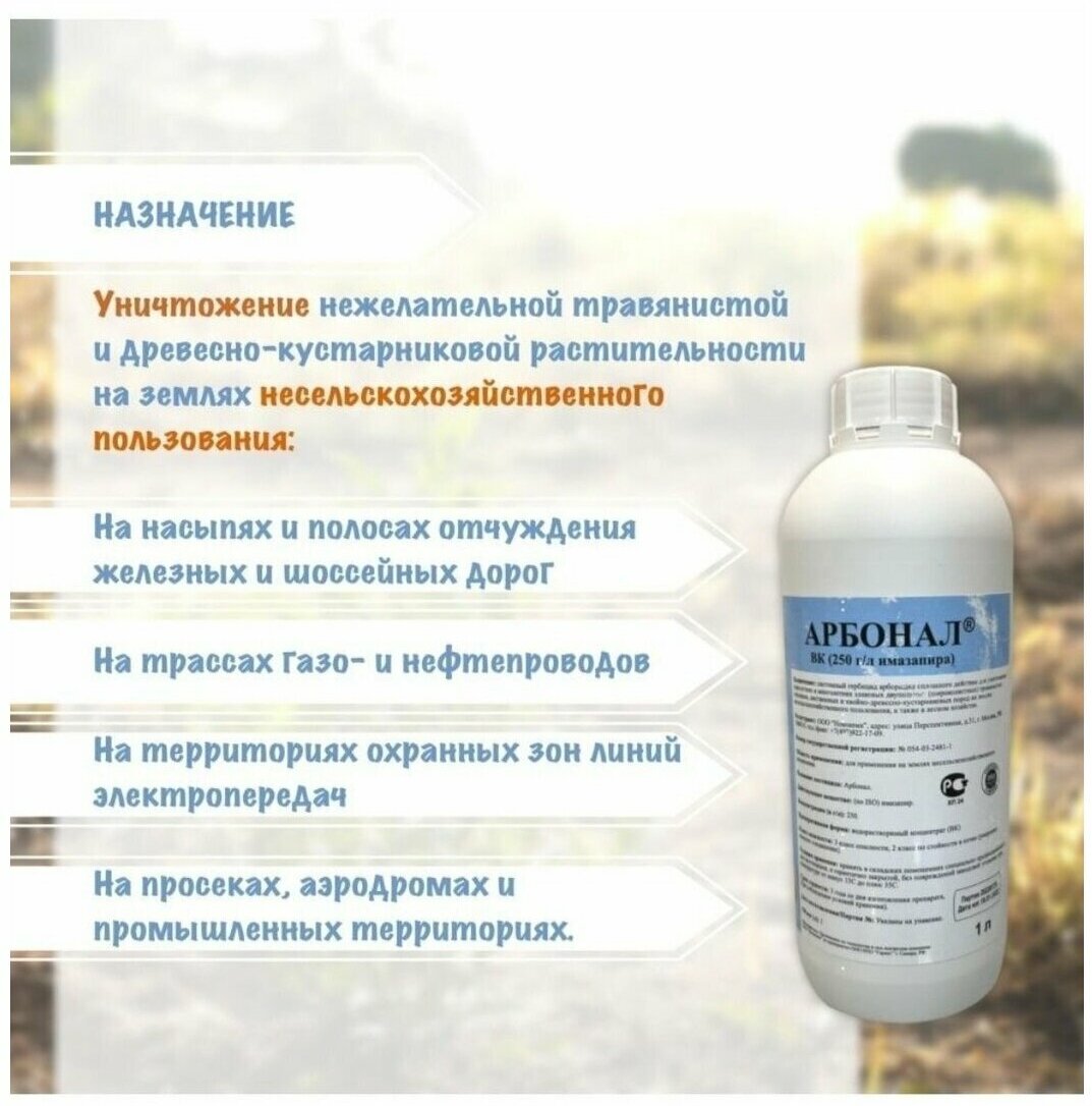 Арбонал, ВК - эффективный гербицид сплошного (общеистребляющего) действия для уничтожения всех видов нежелательной растительности. Препарат применяется только на землях несельскохозяйственного пользования и обладает длительным эффектом сдерживания повторного отрастания сорной растительности.