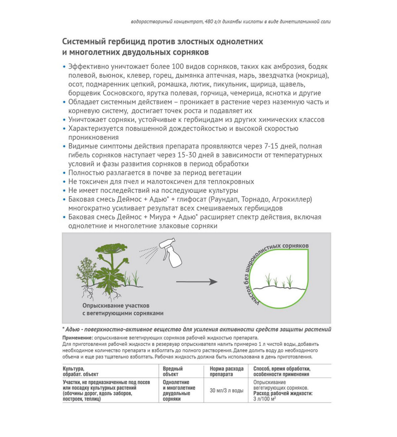 Эффективный препарат от злостных широколистных сорняков для очистки целинных участков, дорожек, площадей вдоль заборов. К Деймосу чувствительны более 40 видов двудольных сорняков, таких как амброзия, бодяк полевой, одуванчик, клевер, горец, дымянка аптечная, марь, звездчатка (мокрица), осот, подмаренник цепкий, ромашка, лютик, пикульник, щирица, щавель, борщевик Сосновского, ярутка, полынь, горчица, чемерица, яснотка и другие. У препарата хорошие показатели безопасности: он не токсичен для пчел и малотоксичен для теплокровных, не имеет воздействия на последующие культуры и полностью разлагается в почве за период вегетации. Деймос от злостных сорняков разводится водой по инструкции и заливается в опрыскиватель. Обработку сорняков проводят в ранние фазы их роста, лучше всего весной. Обладая системным действием, препарат проникает в растение через наземную часть и корневую систему, достигает точек роста и подавляет их, уничтожая даже сорняки, устойчивые к препаратам из других химических классов (глифосатам). Видимые симптомы действия препарата проявляются через 7-15 дней, полная гибель сорняков наступает через 15-30 дней в зависимости от температурных условий и фазы развития сорняков в период обработки. После применения препарата остается злаковая поросль, она может служить временным газоном и удерживать почву от размывания дождями. Это удобно если на участке планируется строительство.