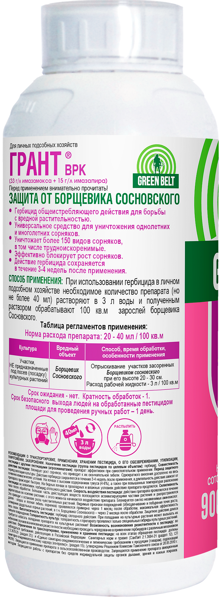 Грант - препарат общеистребляющего действия для борьбы с вредной растительностью, универсальное средство сплошного действия от злостных сорняков, уничтожает более 150 видов однолетних и многолетних сорняков, в том числе трудноискоренимые: борщевик, одуванчик и др.