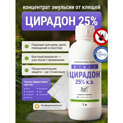 Средство от клещей на участке обладает острым инсектоакарицидным действием в отношении широкого спектра видов синантропных членистоногих, блох и иксодовых клещей. Повторные обработки проводят по энтомологическим показаниям. Продолжительность остаточного действия в природных стациях при обработках от иксодовых клещей — 1–1,5 месяца. Рабочий раствор цирадона имеет небольшой запах, который быстро выветривается.
