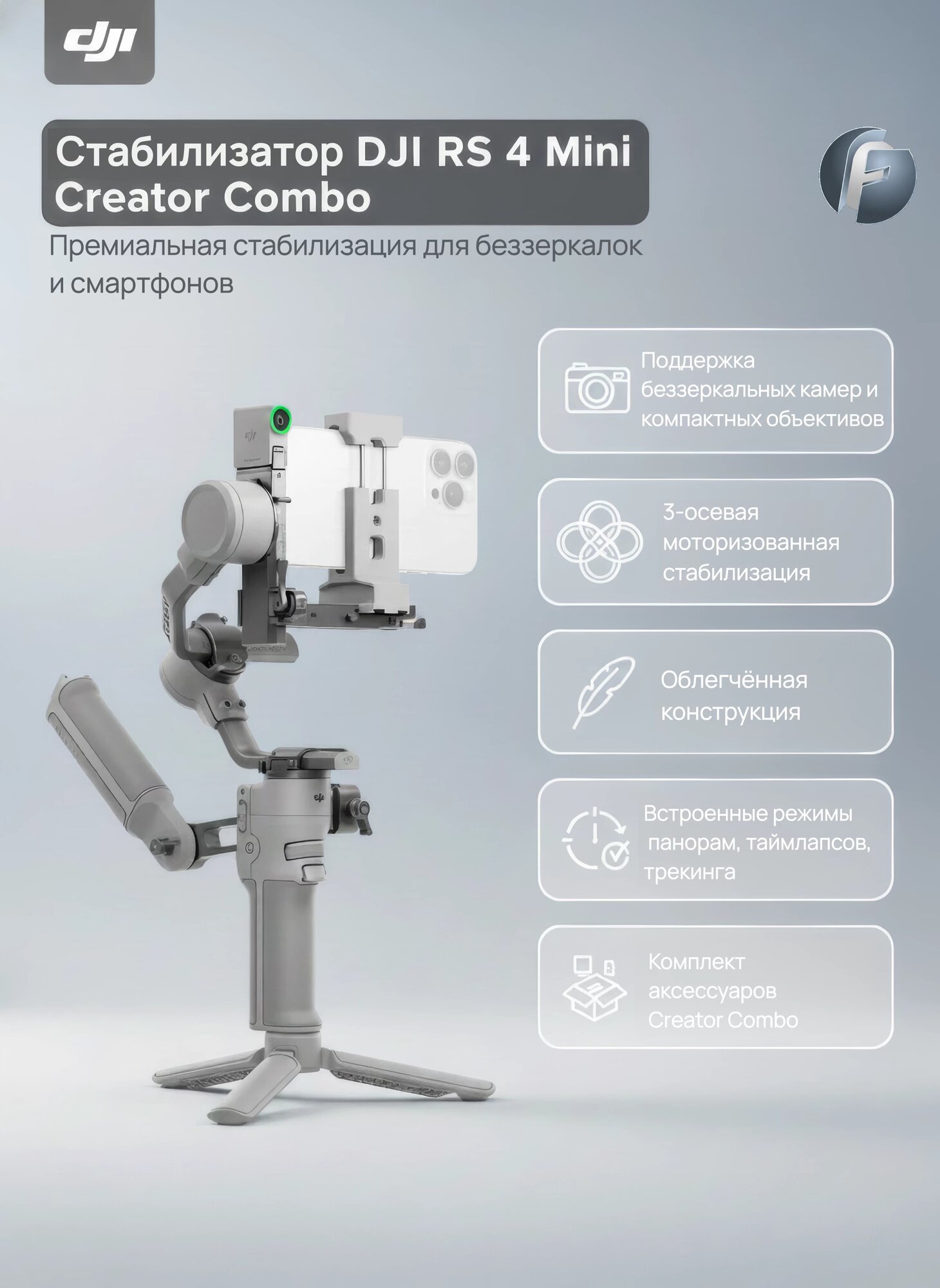 Стабилизатор DJI RS 4 Mini Creator Combo для смартфонов и беззеркалок, нагрузка до 2кг.: сравнение цен, характеристики, фото, актуальное наличие и цены.
