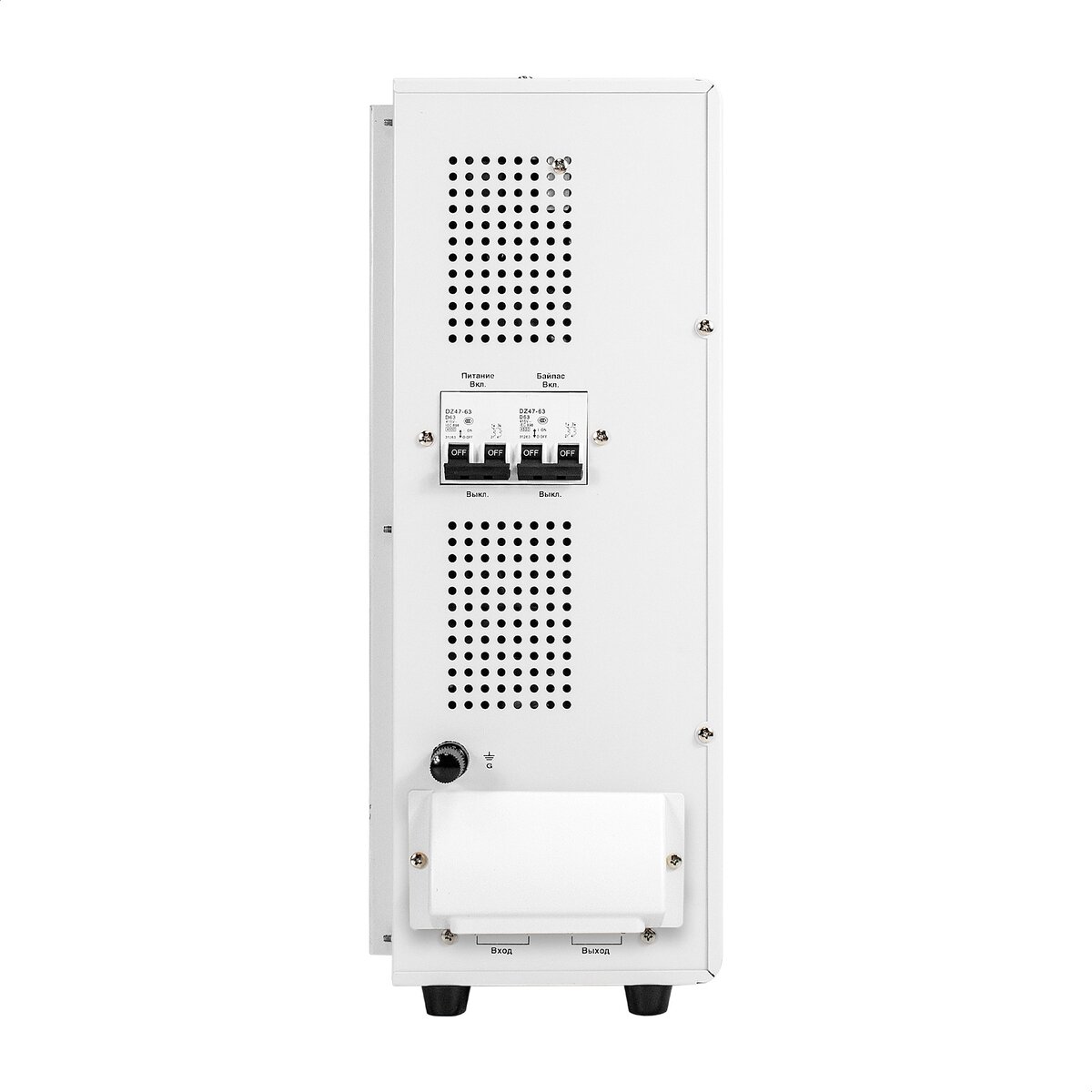 Стабилизатор оснащен 2 розетками Schuko и клеммной колодкой 4P для подключения нагрузки. Розетки расположены на боковой панели устройства, что обеспечивает удобство использования.