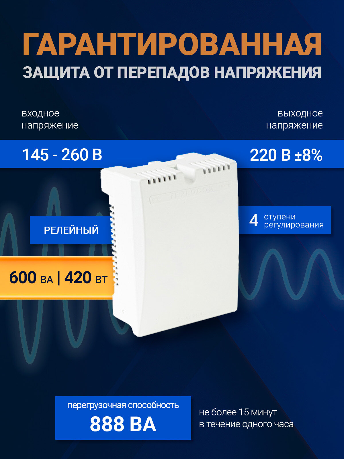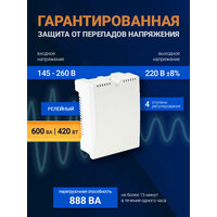 Стабилизатор напряжения для газового котла. Мощность нагрузки 888 ВА, диапазон сети 145 — 260 В, полная мощность во всем диапазоне сети, стабилизация напряжения вольтдобавочного типа, микропроцессорное управление, защитное отключение при авариях в сети с автоматическим восстановлением, индикация аварийных ситуаций. Малогабаритный пластиковый корпус настенного исполнения. Быстрое и простое подключение ; не сложнее удлинителя. Гарантия — 5 лет.