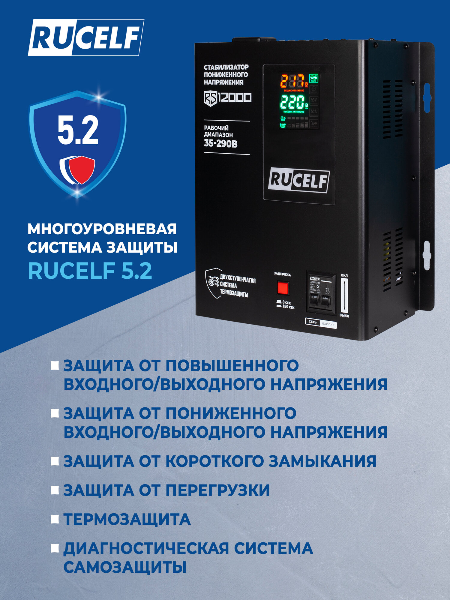Купить Стабилизатор напряжения RUCELF RS-12000, релейный, однофазный, от пониженного напряжения, мощность 12000ВА, настенный с доставкой по всей России.