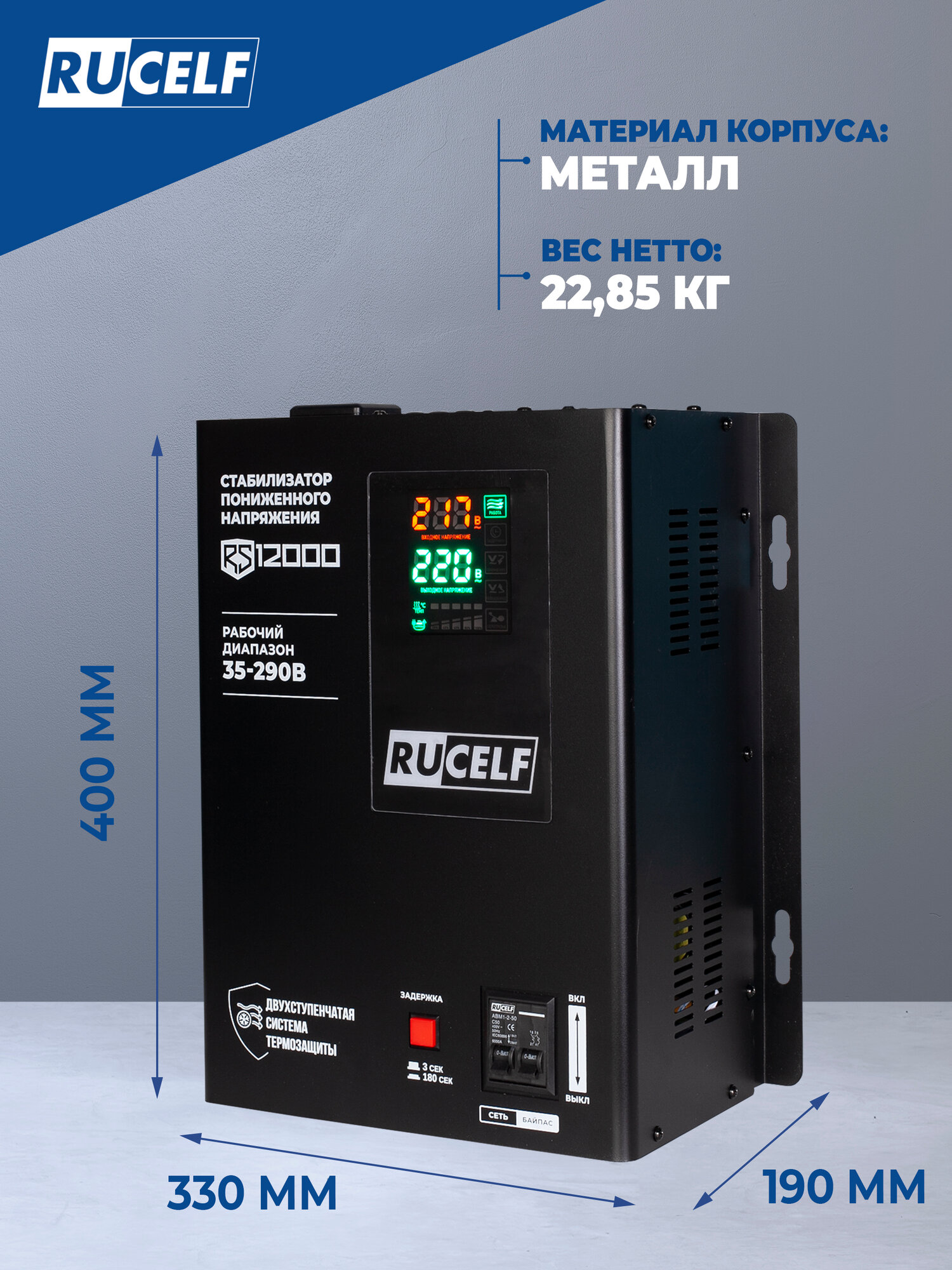 Стабилизатор напряжения RUCELF RS-12000, релейный, однофазный, от пониженного напряжения, мощность 12000ВА, настенный: сравнение цен, характеристики, фото, актуальное наличие и цены.