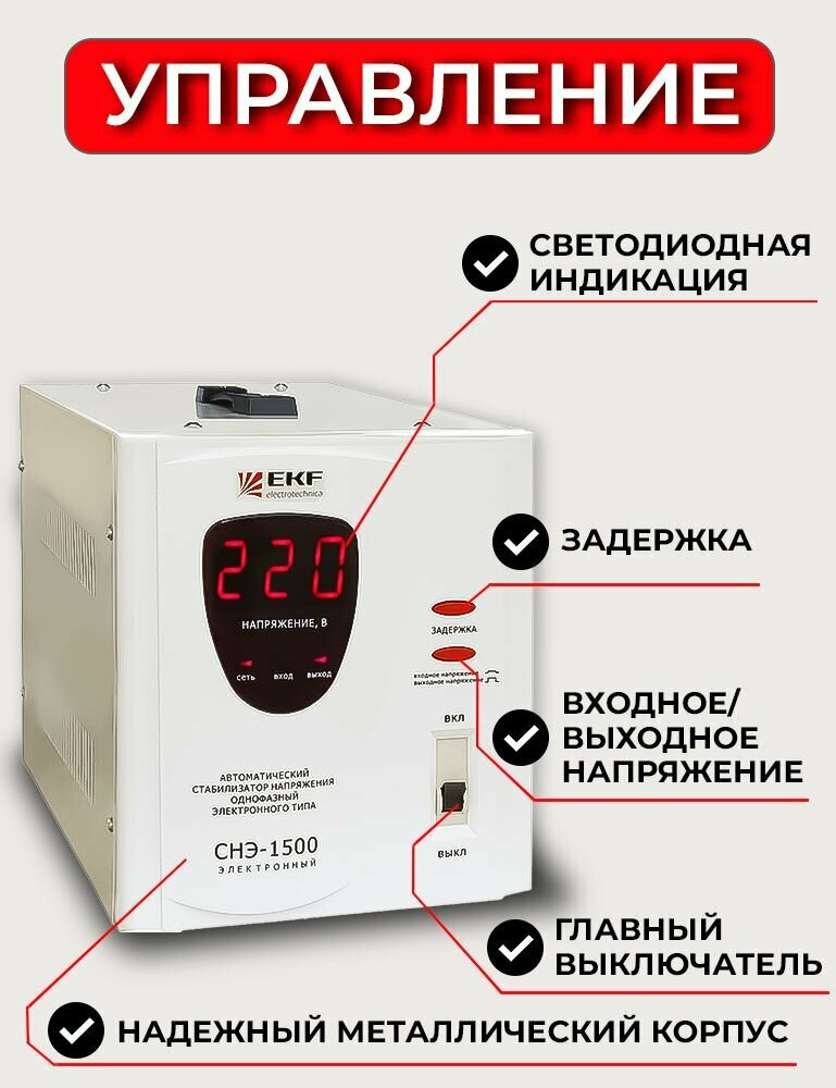 Купить Стабилизатор СНЭ1-1500ВА электронный ЭКФ с доставкой по всей России. Стабилизатор СНЭ1-1500ВА электронный ЭКФ: сравнение цен, характеристики, фото, актуальное наличие и цены.