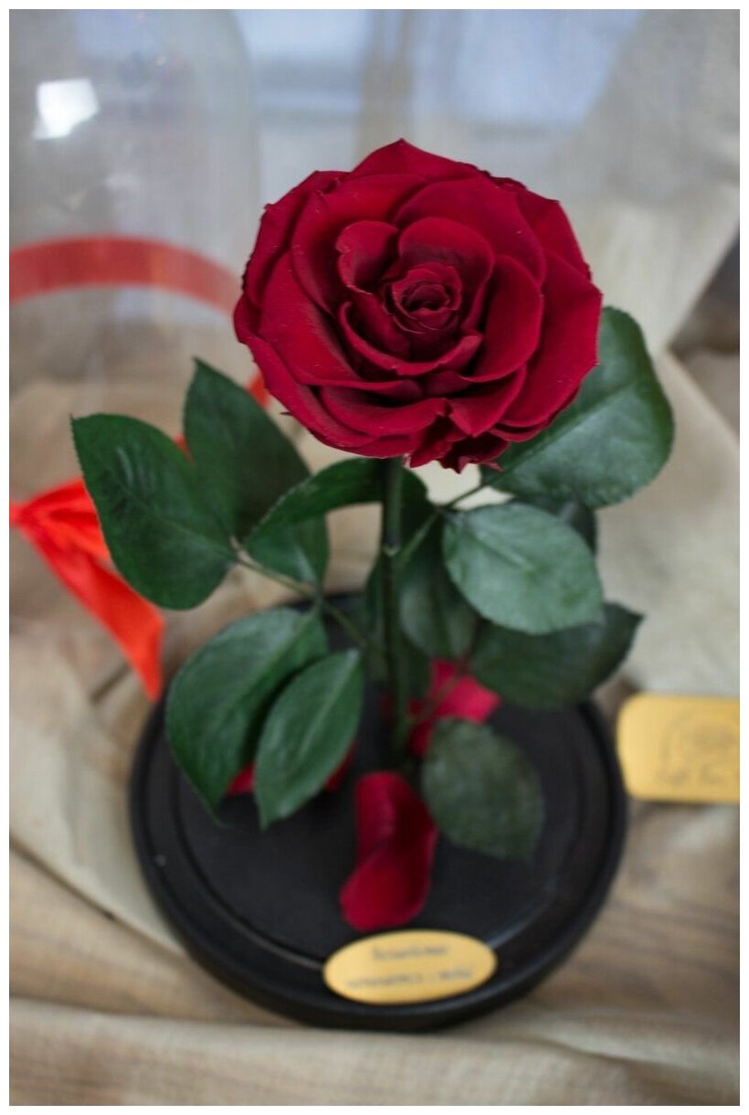 Эта живая роза выращена в Эквадоре и обработана специальным веществом на основе глицерина, за счет чего будет радовать своего обладателя от 5 лет и не требовать особого ухода. Цветок абсолютно безопасен для взрослых и детей.