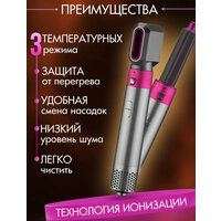 Мультистайлер 5в1 прекрасно выполняет функцию сушки и профессиональной укладки волос. В комплекте к стайлеру имеется пять насадок - утюжок выпрямитель, щипцы для завивки кудрей, щетка расческа, брашинг и насадка для сушки волос. Стайлер 5in1 можно использовать как обычный фен с ионизацией. Благодаря ионизации Ваши волосы покрываются ионами, обеспечивающие защиту от негативного внешнего воздействия. Наша плойка создана для красоты и здоровья ваших локонов. Тройная плойка для волос производит идеальное выпрямление, позволяет завить локоны и создать самые лучшие прически. Три температурных режима, с помощью которых Вы сможете подобрать для себя наиболее подходящий вариант. Профессиональный уход за волосами у вас дома и для парикмахеров. Плойка для завивки обеспечит красоту и здоровье волос, по внешнему виду его иногда можно спутать с мультистайлером Dyson. Идеальный подарок для подруги, жены, сестры и мамы. Мультистайлер 5 в 1 легкий и компактный его удобно брать с собой. Стайлер имеет цилиндрические насадки для создания локонов или волн, а также щетки для разглаживания и придания объема. Подберите насадки индивидуально в зависимости от своего типа волос и желаемой укладки или выберите один из наших комплектов. В стайлере для укладки волос используется аэродинамическое явление, известное как эффект Коанда. Плойка для завивки волос создает вихревые потоки, которые притягивают и накручивают волосы на насадку. Укладка с помощью воздуха, без экстремальных температур. Фен для волос, отлично высушивает волосы без вреда для них. Мультистайлер для волос, имеет 5 насадок, 3 режима работы, время нагрева 10 сек. Отличный набор для укладки. Может заменить: фен, плойку, щипцы для укладки, щётку для выпрямления, электробигуди, щётку для придания объема. Компактный, удобно брать в различные поездки с собой. Может послужить отличным подарком коллеге на работе, маме, бабушке, сестре, внучке, дочке, подруге. Идеален как профессиональная парикмахерская техника. Размеры, мм : 260х50