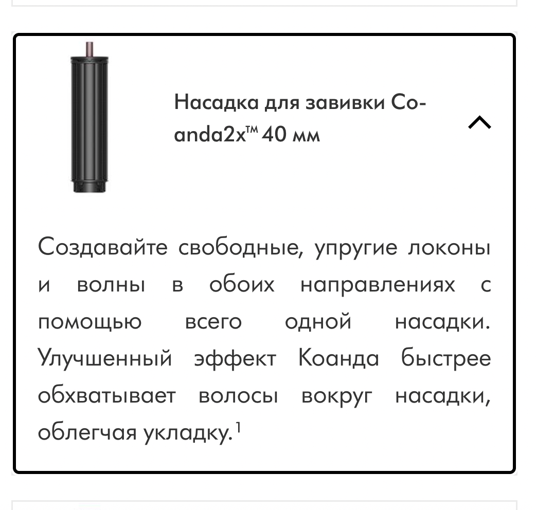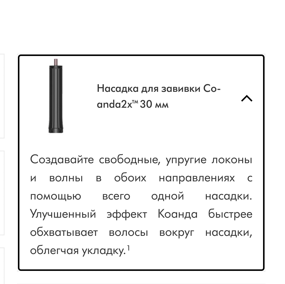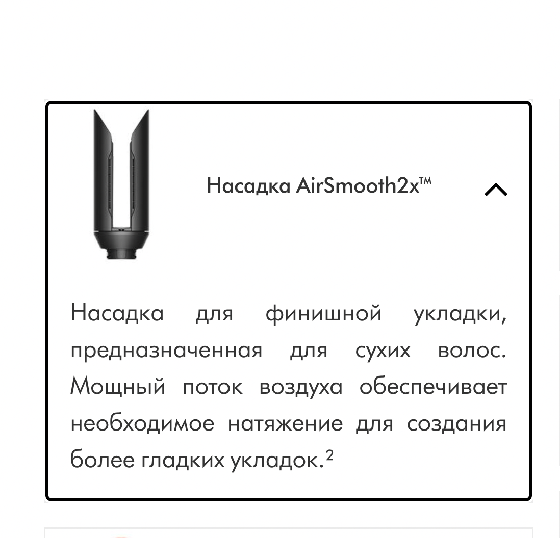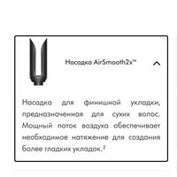| Дополнительная информация | 6 насадок: - Насадка-брашинг. - Мягкая щетка для выпрямления волос. - Длинная цилиндрическая насадка Airwrap 40мм. - Длинная коническая насадка Airwrap 30мм. - Насадка для разглаживания волос с эффектом Коанда. - Насадка-фен для быстрой сушки. Бокс для хранения. Щетка для очистки фильтра. |