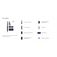 | Дополнительная информация | 6 насадок: - Насадка-брашинг. - Мягкая щетка для выпрямления волос. - Длинная цилиндрическая насадка Airwrap 40мм. - Длинная коническая насадка Airwrap 30мм. - Насадка для разглаживания волос с эффектом Коанда. - Насадка-фен для быстрой сушки. Бокс для хранения. Щетка для очистки фильтра. |
