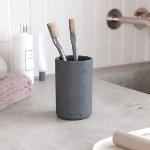 Cтакан для зубных щеток Astrid Slim от MUSKO HOME - это стильный интерьерный аксессуар, изготовленный вручную из архитектурного бетона и покрытый защитным лаком, который не только защищает поверхность от воздействия влаги и грязи, но и придаёт ей необычную текстуру. Благодаря использованию такого покрытия, органайзер для зубных щёток можно без опасений использовать в ванной комнате.