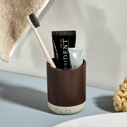 Керамический стакан для зубных щёток. Высота изделия — 9 см, диаметр — 7 см. Подойдёт для хранения одной или нескольких зубных щёток. Надёжное устойчивое основание позволяет размещать стакан на любых поверхностях, не опасаясь соскальзывания и падения. Верхняя часть покрыта матовой коричневой глазурью, а дизайн нижней части имитирует окалину. Изделие легко чистить, оно устойчиво к сколам и царапинам. Благодаря спокойной расцветке хорошо будет смотреться в природных и минималистичных интерьерах. Отлично сочетается со всеми аксессуарами коллекции Naturel.