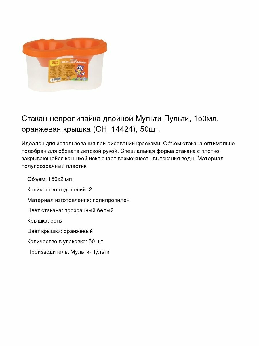 Стакан-непроливайка двойной Мульти-Пульти, 150мл, оранжевая крышка (СН_14424), 50шт.: сравнение цен, характеристики, фото, актуальное наличие и цены.