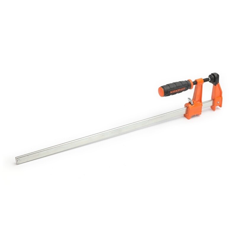 Струбцина F-образная Pony Jorgensen имеет чугунные стационарные и раздвижные головки с оранжевым порошковым покрытием, объединены с высокоуглеродистым стальным стержнем, устойчивым к коррозии, который обладает колоссальной прочностью на растяжение 5645 кг на квадратный см. Быстродействующая скользящая головка имеет резьбу для установки винта из холоднотянутой стали с большой удобной ручкой и поворотной накладкой. Оригинальная конструкция многодискового сцепления Jorgensen позволяет скользящей головке надежно удерживаться в любой точке штанги.
