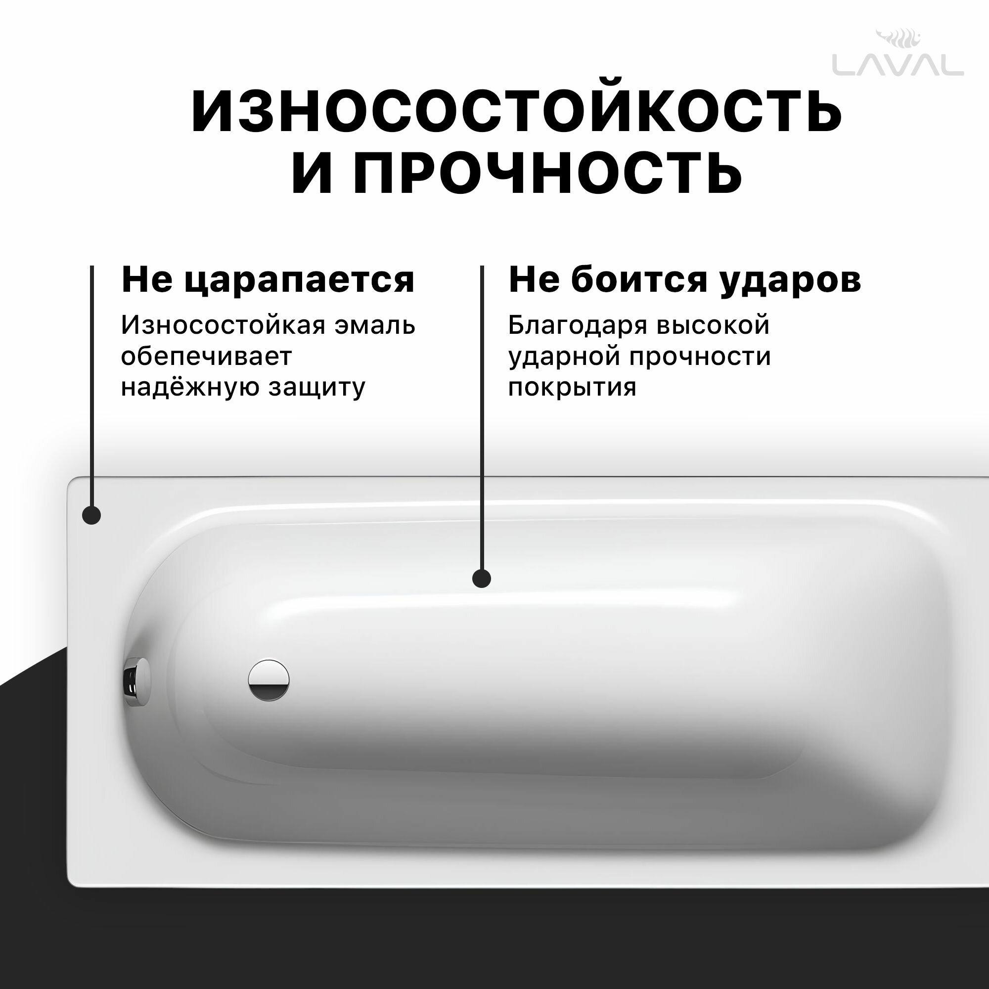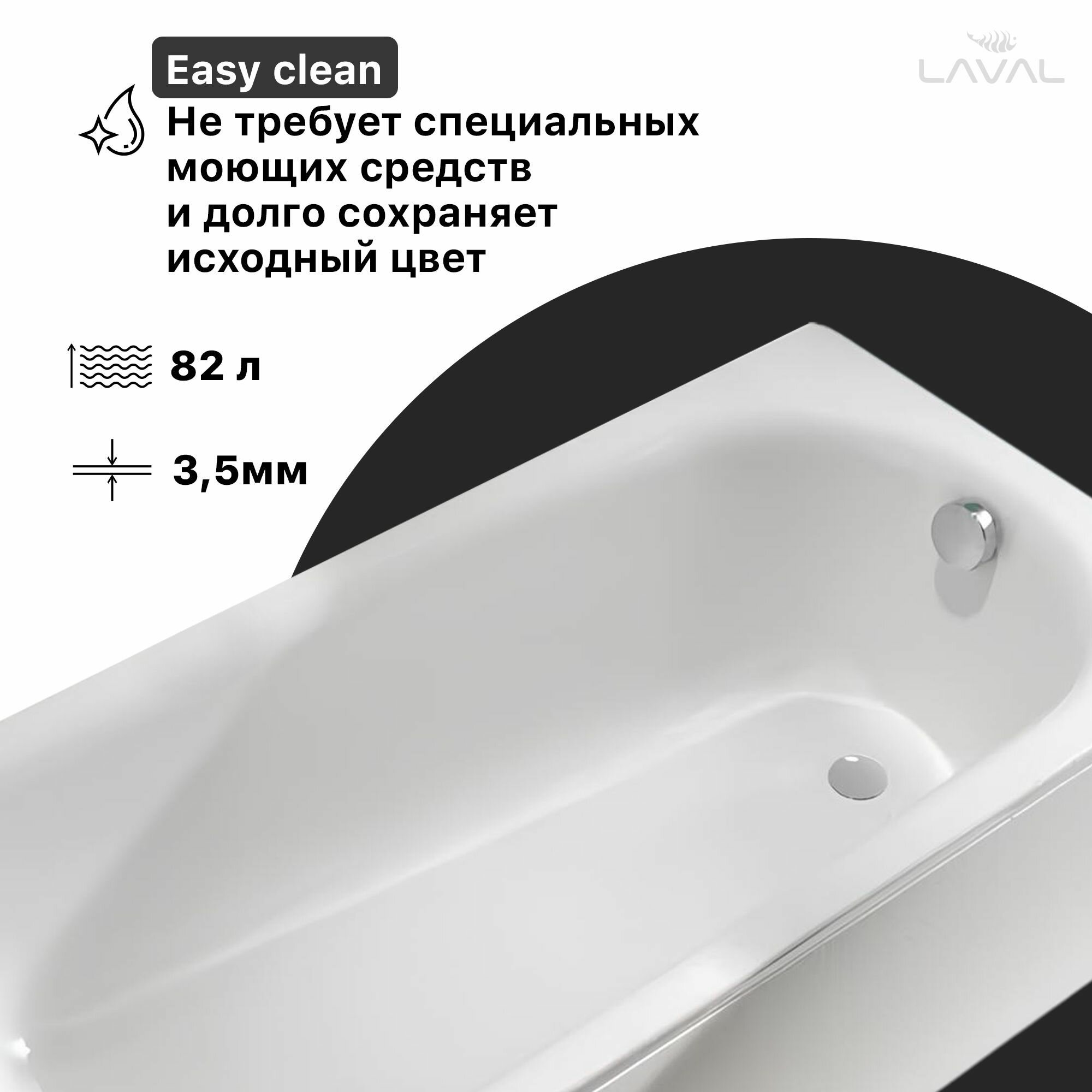 Ванна выполнена из уникального материала: сталь-эмали. Это сочетание стали и стекла, совмещающее в себе лучшие качества обоих компонентов. Высокая твердость защищает ее от царапин, бытовых повреждений и перепадов температур, что продлевает срок службы изделия.