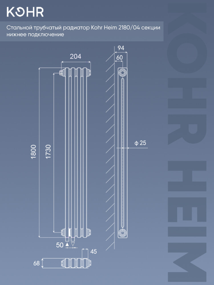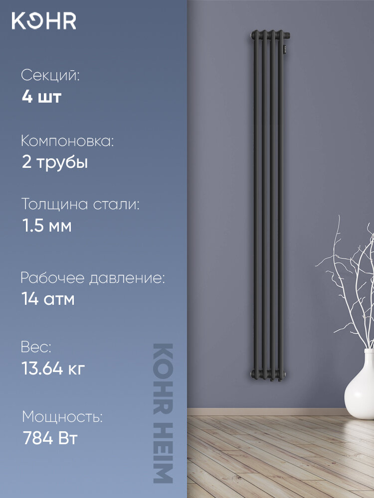 Стальной трубчатый радиатор Kohr Heim 2180/04 секции H01 с нижним подключением черный: сравнение цен, характеристики, фото, актуальное наличие и цены.