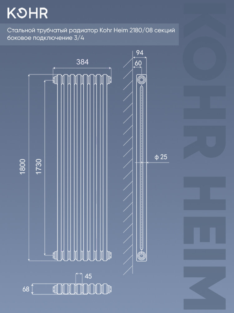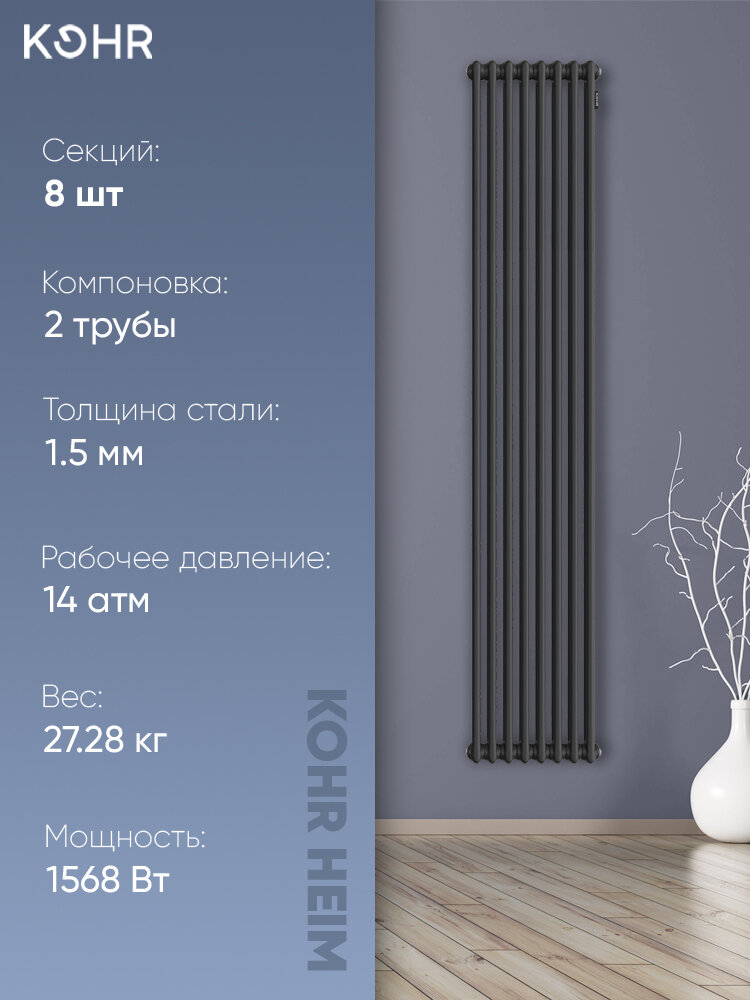 Купить Стальной трубчатый радиатор Kohr Heim 2180/08 секций с боковым подключением 3/4 черный с доставкой по всей России.