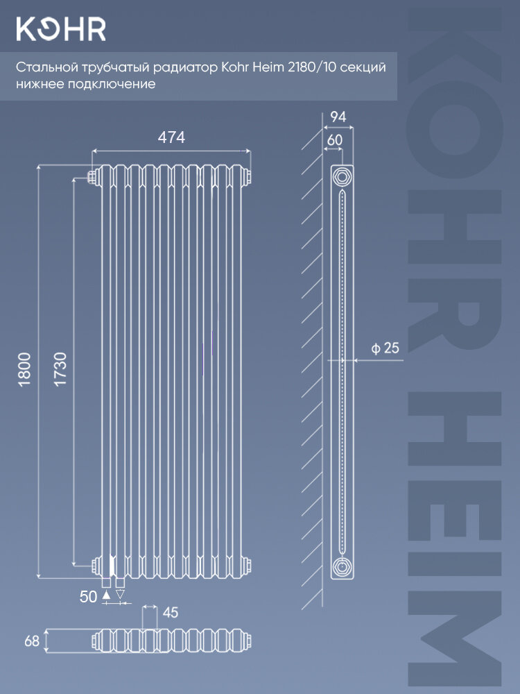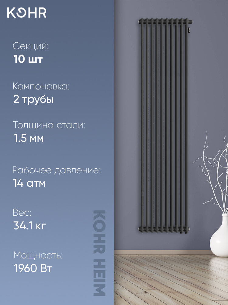 Стальной трубчатый радиатор Kohr Heim 2180/10 секций H01 с нижним подключением черный: сравнение цен, характеристики, фото, актуальное наличие и цены.