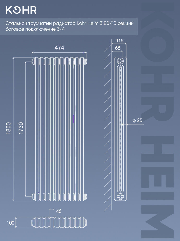 Стальной трубчатый радиатор Kohr Heim 3180/10 секций с боковым подключением 3/4 черный: сравнение цен, характеристики, фото, актуальное наличие и цены.