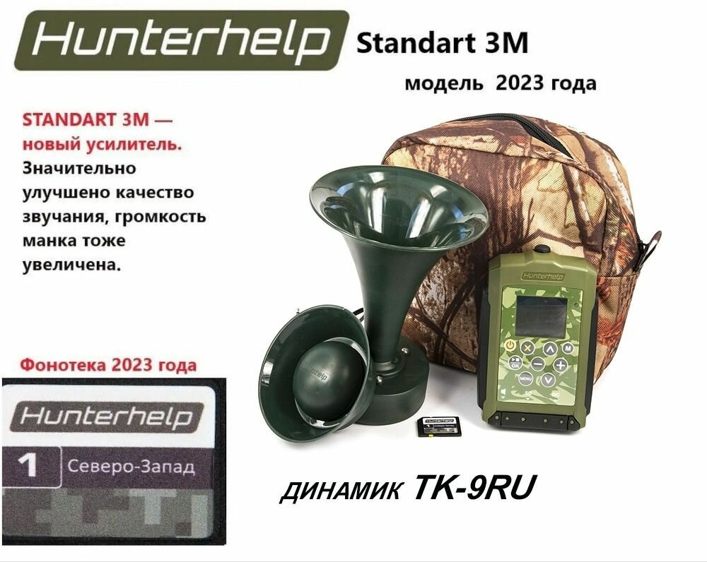 Hunterhelp STANDART 3M — новый усилитель! Модель 2023 года Значительно увеличена качество звука. Громкость манка тоже выросла ( усилителя - цифровой, 25 Вт. раньше было 10 Вт ) Фонотека №1 Северо-Запад 2023 года выпуска Электронный имитатор голосов птиц и зверей. Воспроизводит звуковую информацию, записанную в специальном формате в виде треков на съемную карту памяти. Качество воспроизведения - DVD-audio (48 кГц, 16 бит). Оснащен TFT дисплеем, позволяющим комфортно произвести настройки и выбор необходимой фонограммы. Управление манком осуществляется при помощи кнопок на передней панели. Комплектуется внешним динамиком ТК-9RU, реалистично воспроизводящим голоса гусеобразных, кабана, косули, вороны. Особенности: