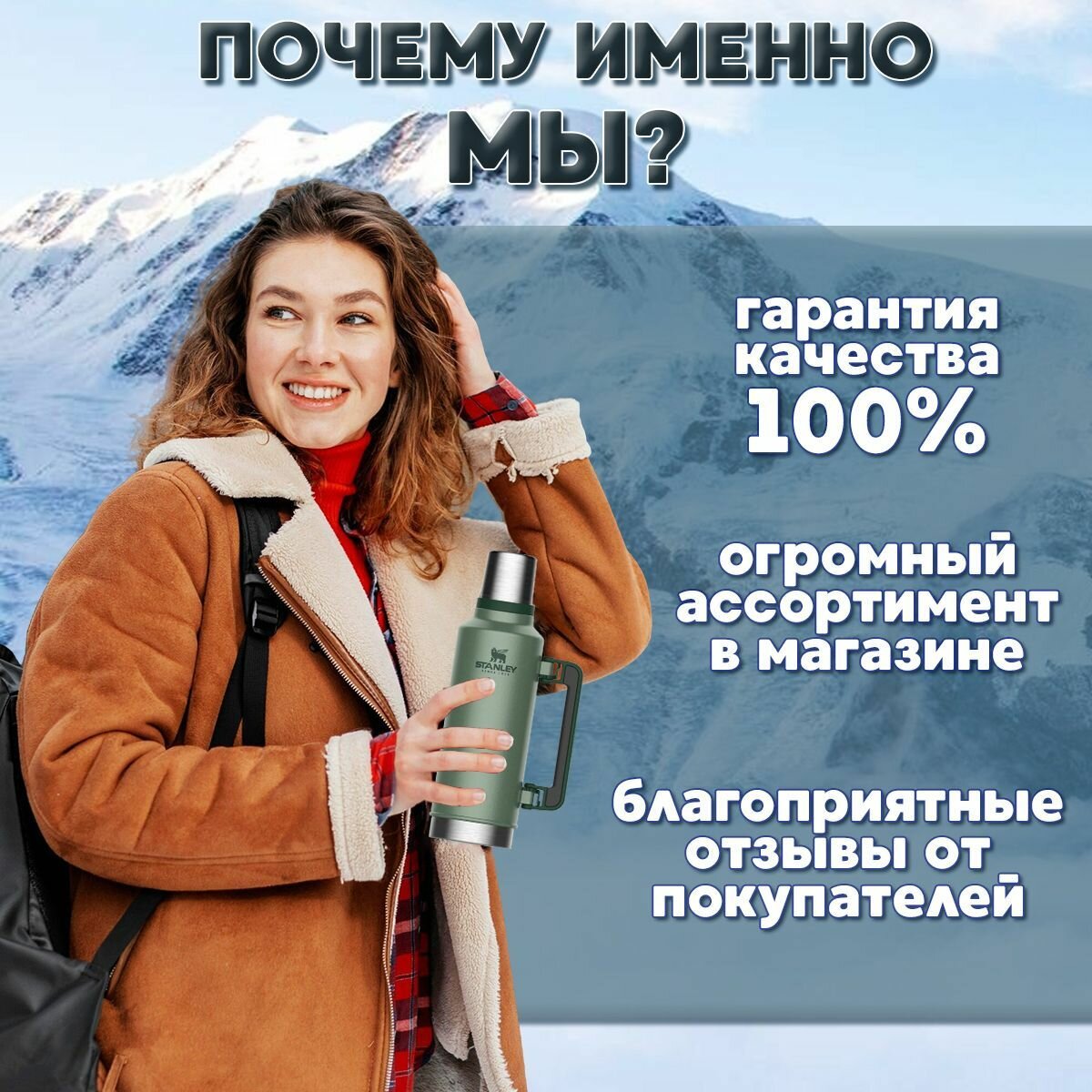 Термос STANLEY CLASSIC 10-11969-001 темно-зеленый 1,9L: идеальный выбор для активного отдыха и путешествий! Термос STANLEY CLASSIC объемом 1,9 литра — это незаменимый спутник для тех, кто ценит удобство и качество в каждодневной жизни и в походах. Известный бренд Stanley на протяжении многих лет радует нас своими надежными и стильными решениями, и этот термос не стал исключением. Он отлично подойдет как для профессионалов на природе, так и для любителей комфорта дома. Изготовленный из высококачественной нержавеющей стали, термос STANLEY CLASSIC отличается невероятной прочностью и долговечностью. Это означает, что он будет служить вам верой и правдой даже в самых суровых условиях. Благодаря своей конструкции термос сохраняет температуру содержимого на протяжении долгого времени – ваш горячий кофе или чай останется теплым, а холодные напитки будут освежающими до самого последнего глотка. Крышка для термоса легко превращается в кружку, что позволяет пить прямо из неё, не теряя ни капли удобства. Кружка термос от Stanley — это не только практично, но и стильно. А благодаря компактному дизайну, термос легко помещается в рюкзак, что делает его идеальным выбором для туристов и путешественников. Термос объемом 1,9 литра подходит для всех, кто хочет взять с собой достаточно горячих или холодных напитков, чтобы поделиться ими с друзьями или семьей на природе. А для семейных прогулок или детских походов у вас всегда под рукой будет термос детский и термокружка детская от Stanley, что обеспечит приятные моменты в компании ваших любимых. Варианты меньшего объема, такие как термос 1 л, также присутствуют в ассортименте Stanley для тех, кто предпочитает более компактные решения. Все продукты Stanley разрабатываются с учетом современных требований и удобства, что делает их незаменимыми в любом наборе для похода. Не упустите возможность легкого и комфортного питья в любом месте! Термос STANLEY CLASSIC 1,9L темно-зеленого цвета станет вашим надежным спутником в любых приключениях. Сделайте свой выбор в пользу качества и стиля с термосами Stanley — они точно не подведут!