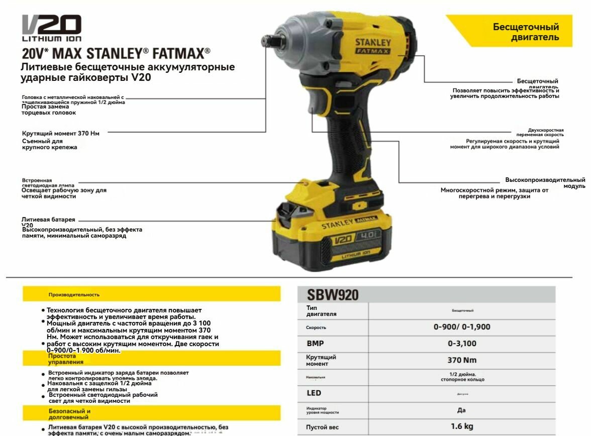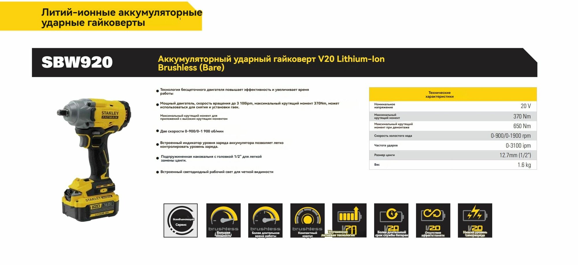 Купить Stanley SBW920 Бесщеточный аккумуляторный ударный гайковерт V20 Lithium-Ion с доставкой по всей России.