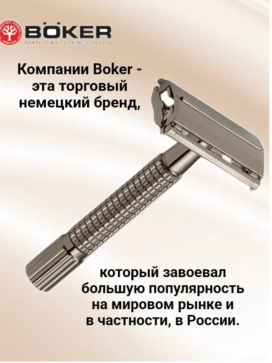 Станок для бритья производителя Böker представляет собой классическую бритву с универсальным прямым срезом, обеспечивающим наиболее удобное применение. В отличие от дешевых вариантов лезвие данного станка фиксируется очень плотно и не допускает свободного хода, ведущего к порезам. А прочный металлический сплав с хромированным покрытием при правильном уходе прослужит долгие годы. В сочетании с качественным лезвием станок Böker Butterfly Gunmetal Grey позволяет получить великолепное качество бритья и ощущение гладкой кожи всего за два-три прохода! И это при том, что на лезвие давить почти не приходиться, станок бреет практически под собственным весом, удаляя лишние волосы буквально с одного прикосновения, не раздражая кожу. Ручка станка эргономична имеет безопасную конструкцию - ребристую поверхность, что минимизирует скольжение бритвы. Легко удерживается даже в намыленной руке. На нижней стороне рукояти нанесено клеймо компании Böker "Каштановое дерево", что подтверждает подлинность изделия. Закрытый тип головки обеспечивает безопасное бритье, а особый механизм "бабочка" позволяет с легкостью менять лезвия. Бритва поставляется в черном картонном футляре с фирменным логотипом и может послужить отличным подарком для мужчины. Лезвия в комплект не входят. Длина: 8.7 см, Вес: 61 гр, Материал: металл, хромированное покрытие; Назначение : безопасная Т-образная бритва, Материал рукоятки: металл, Фирма производитель: Boker Manufaktur SOLINGEN (Германия)