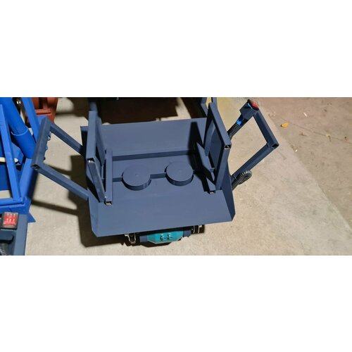 • взять двумя руками за ручки станка, при этом включить вибратор ручным рычагом нажатим на микрик, произвести вертикальный подъем станка на высоту превышающую высоту шлакоблока. Вибрация при этом остаточная (небольшая). При подъеме прижимная рамка должна находится внутри станка.