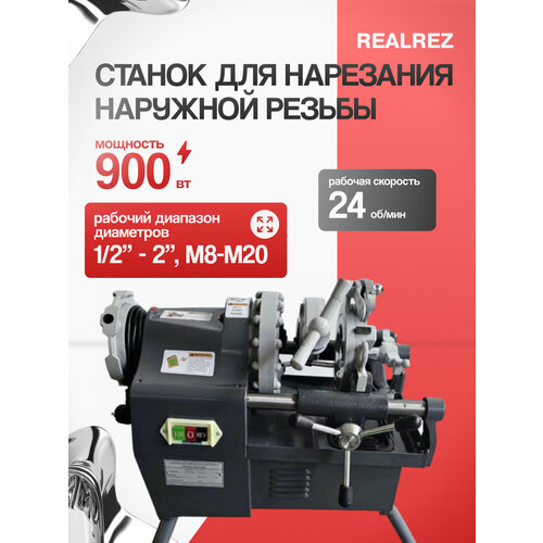 Станок для нарезания наружной резьбы REALREZ RSD20A – резьбонарезной станок подходит для эксплуатации в интенсивном режиме, что позволяет использовать его в серийном производстве. Оборудование служит для нанесения точной и качественной резьбы на металлические заготовки, резки и снятия фасок на различных водопроводных, электрических и газовых трубах размером 1/2–2 дюйма. Диапазон обработки: 1/2-2; Зубья пластины: тип BSPT 50A 1/2-3/4, 1-2.