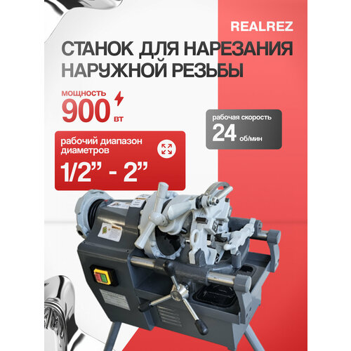 Станок для нарезания наружной резьбы REALREZ RZT-R2 – резьбонарезной станок подходит для эксплуатации в интенсивном режиме, что позволяет использовать его в серийном производстве. Оборудование служит для нанесения точной и качественной резьбы на металлические заготовки, резки и снятия фасок на различных водопроводных, электрических и газовых трубах размером 1/2–2 дюйма. Диапазон обработки: 1/2 -2 ; Зубья пластины: тип BSPT 50A 1/2-3/4, 1-2.