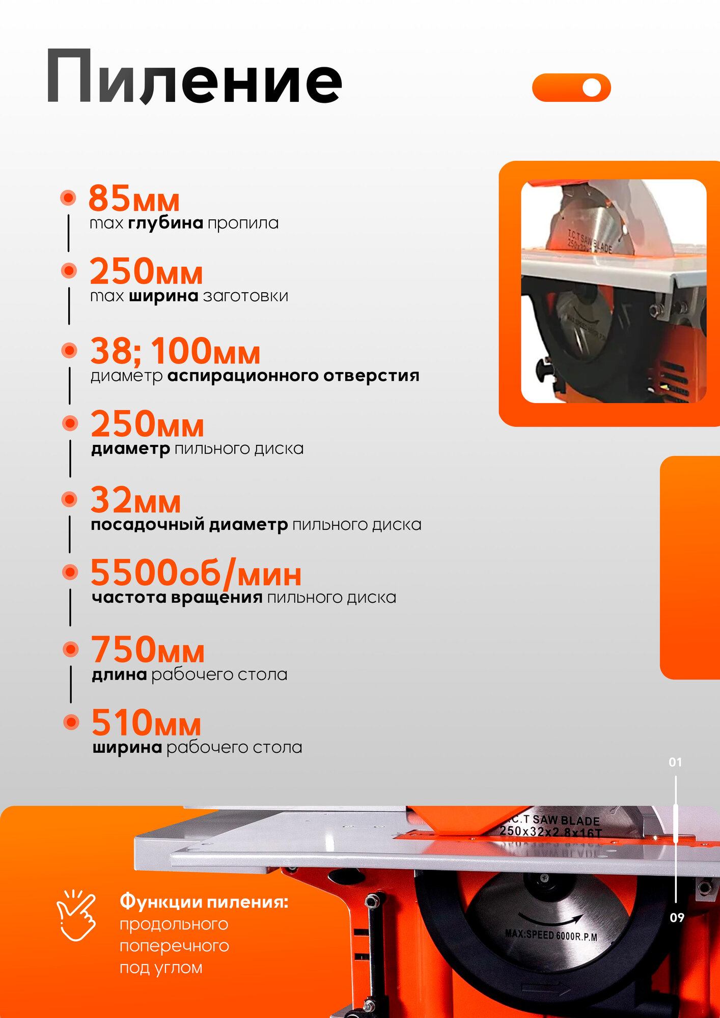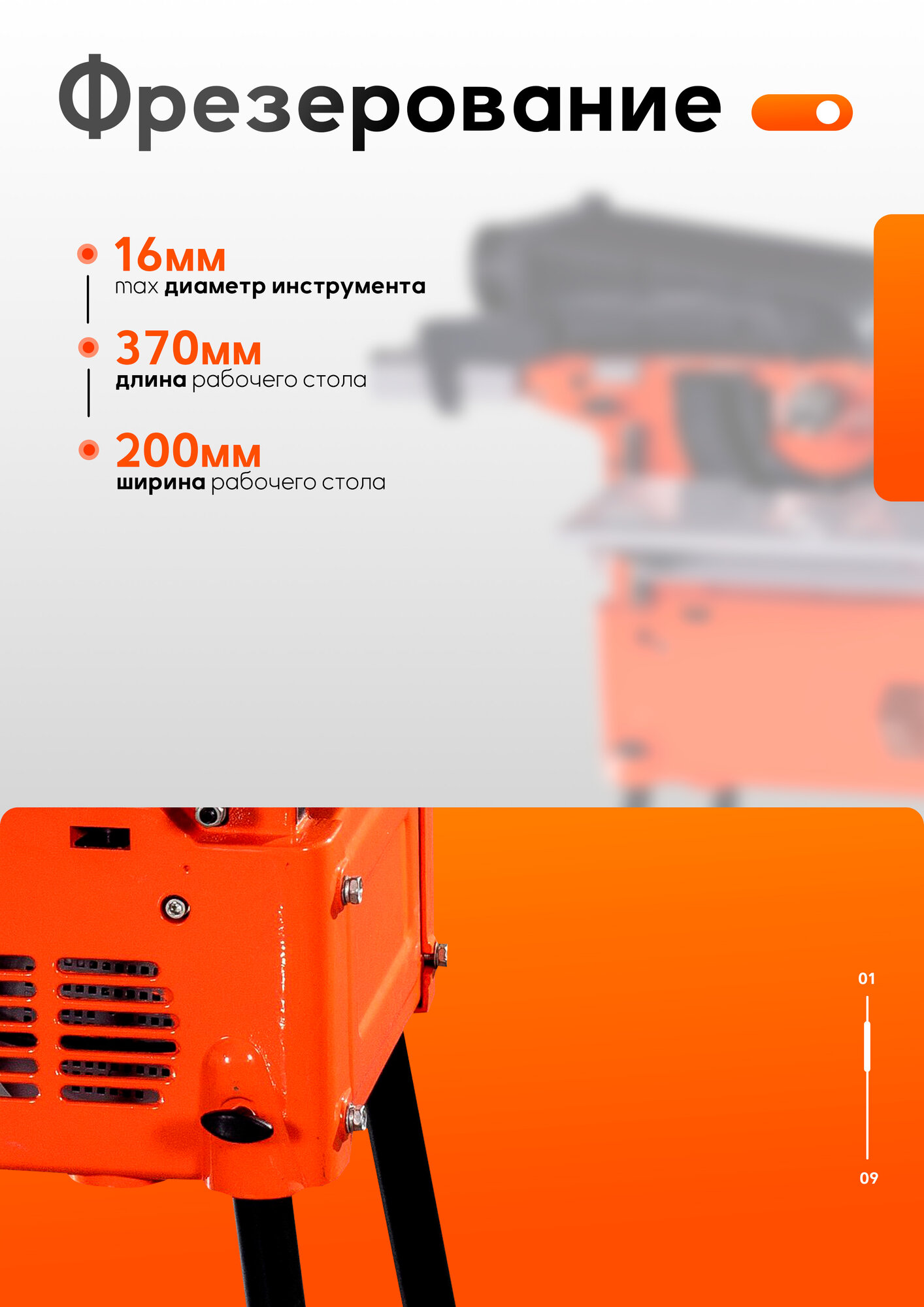 | Дополнительная информация | функции: рейсмусование, строгание по плоскости, строгание под углом, строгание с прижимным устройством, продольная распиловка, продольная распиловка по ребру под углом, отбор четверти, поперечная распиловка, поперечная распиловка под углом, фрезерование, сверление. Тип двигателя - асинхронный. Исполнение по степени защиты от влаги - незащищенное. Встроенное устройство отключения от источника питания при перегреве двигателя. Патрубки диаметром 38 мм и 100 мм для подключения к вытяжной системе вентиляции. Частота вращения пильного диска 2850 об/мин, диаметр диска 250 мм, посадочный диаметр диска 32 мм, максимальная глубина пропила 85 мм. Диаметр дисковой фрезы 125 мм, посадочный диаметр под дисковую фрезу 32 мм, толщина дисковой фрезы 10 мм. Диаметр патрона 16 мм. Комплект поставки: строгальная машина, пильный стол, строгальный стол, прижимное приспособление, приспособление для поперечной распиловки под углом, линейки для строгания и распиловки, переходник для удаления стружки, оснастка, опоры, ножки, средства индивидуальной защиты. |